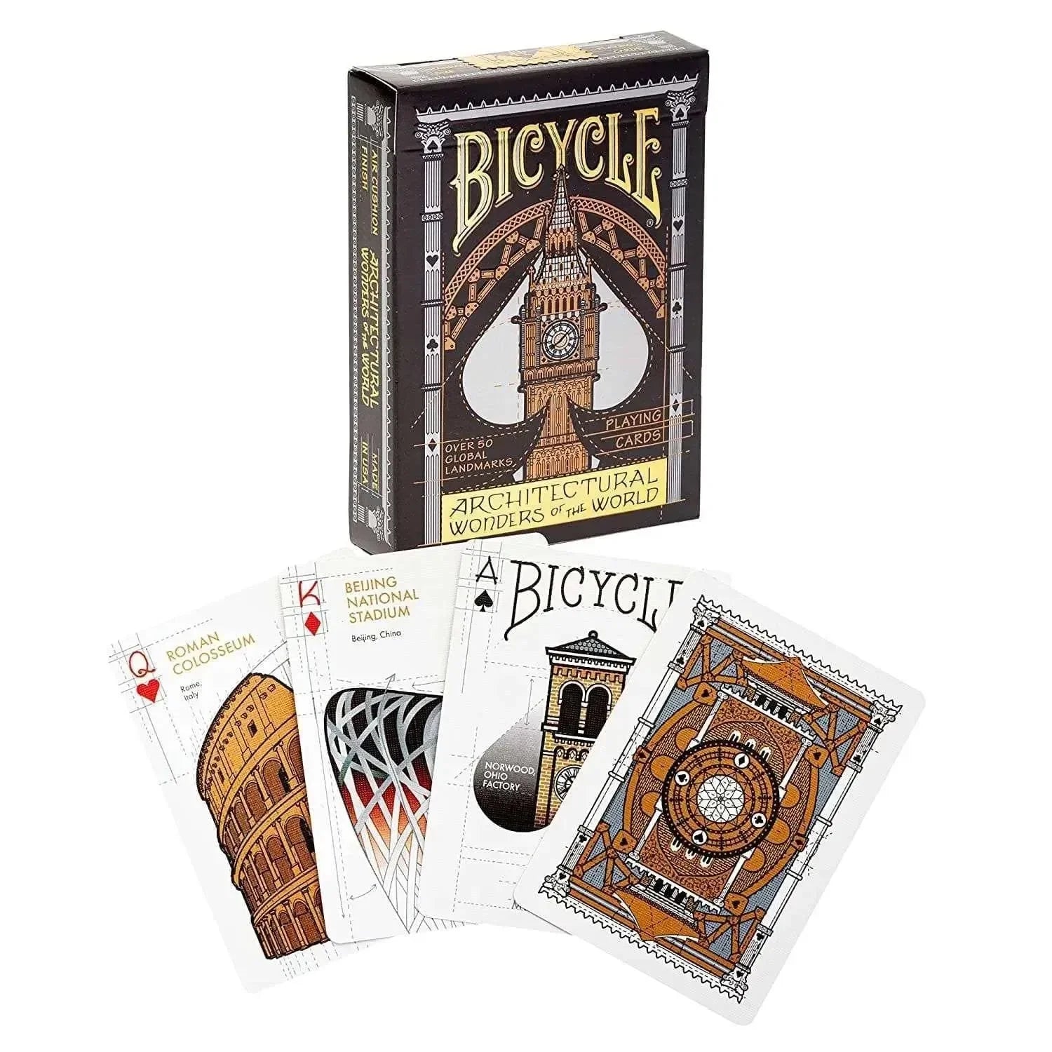 The deck showcases Bicycle’s renowned Patented Classic Air-Cushion Finish, ensuring smooth shuffling and effortless slide during gameplay. Printed on high-quality Bicycle brand cardstock, these cards offer durability and a premium tactile feel that withstands countless rounds of use. The custom card backs, featuring a unique design inspired by architectural themes, and the specially designed Ace of Spades make this deck a true collector’s item. Encased in a luxurious tuck case embossed with fine details and accented with gold foil, the Bicycle Architectural Wonders of World deck doubles as an elegant gift for architecture enthusiasts and card players alike.