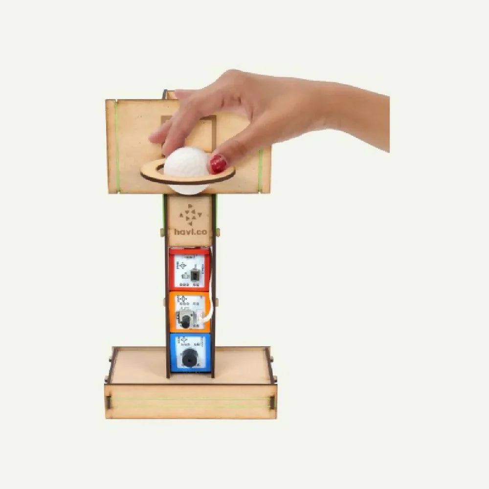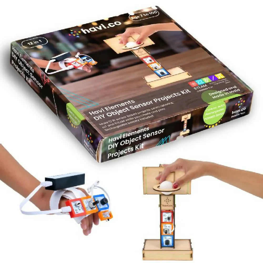 A STEM toy for ages 7+. Make a smart basketball hoop, exercise tracker, music player, fire alarm and 12 such STEAM(STEM+Arts) projects using Havi Elements – DIY Object Sensor Projects Kit. Learn STEM by playing. Best birthday gift and unique rakhi gift for kids aged 7 to 13 years.