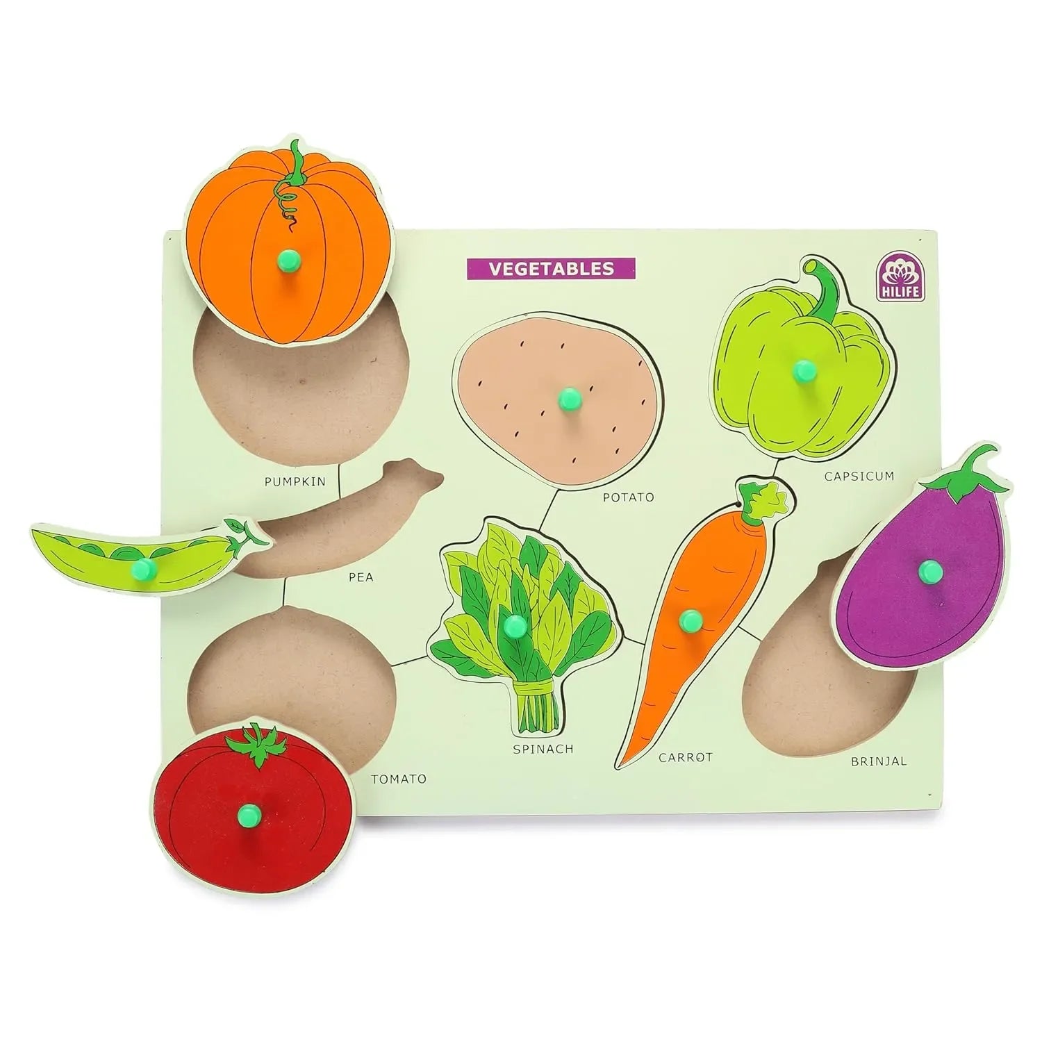 Introduce your child to the colorful and healthy world of vegetables with the HiLife Educational Vegetables Puzzle Board, part of the Gold Series of early learning toys. This wooden peg board is specifically designed for toddlers and preschool-aged children, providing an interactive and hands-on way to learn about different vegetables while also boosting essential developmental skills. With vibrant illustrations and chunky wooden pieces shaped like familiar vegetables such as carrots, tomatoes, and capsicums, this puzzle board helps young children recognize common veggies and understand their significance in a fun, engaging format. Each vegetable piece is fitted with an easy-to-grip peg that allows small hands to grasp, lift, and fit the piece into its designated spot, promoting hand-eye coordination, shape recognition, and fine motor development.
