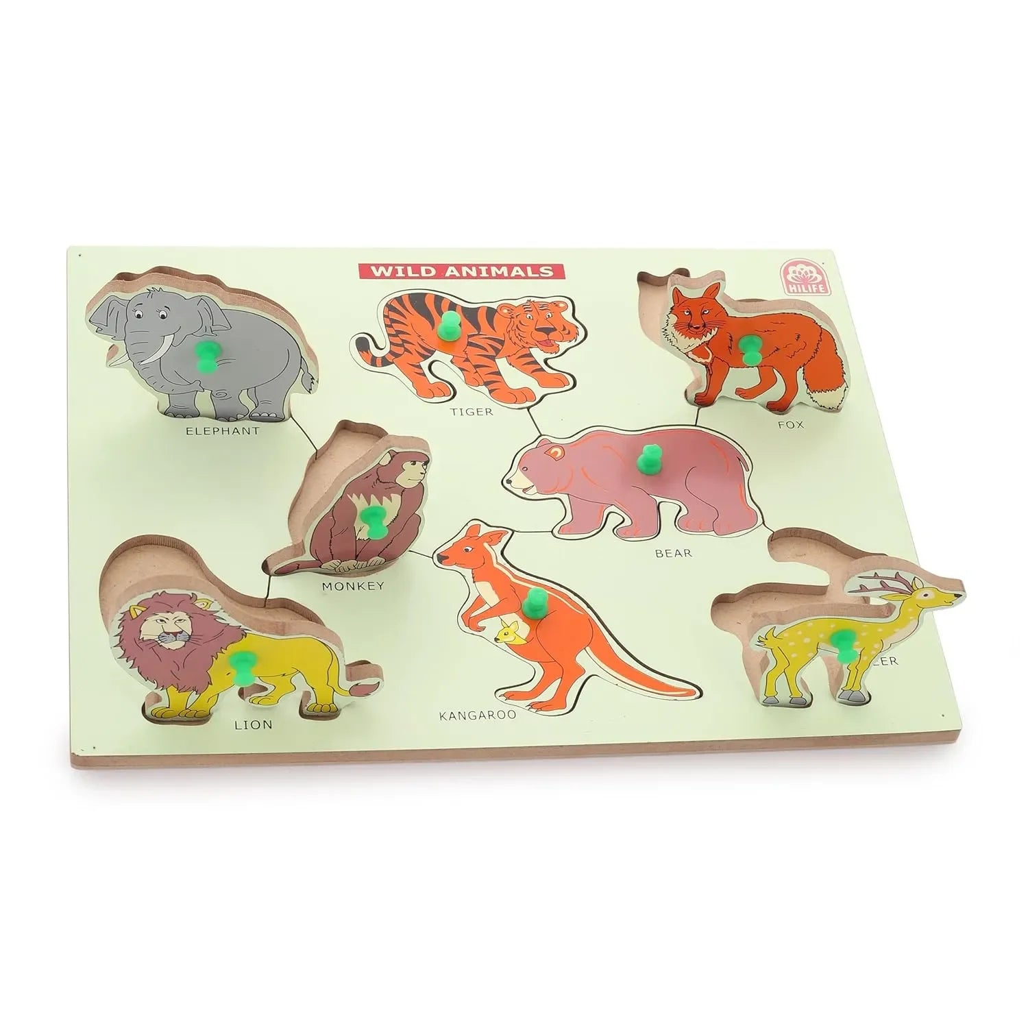 Wild Animals Peg Puzzle Board: Features a collection of popular wild animals such as lion, elephant, giraffe, zebra, and more to build early recognition skills.