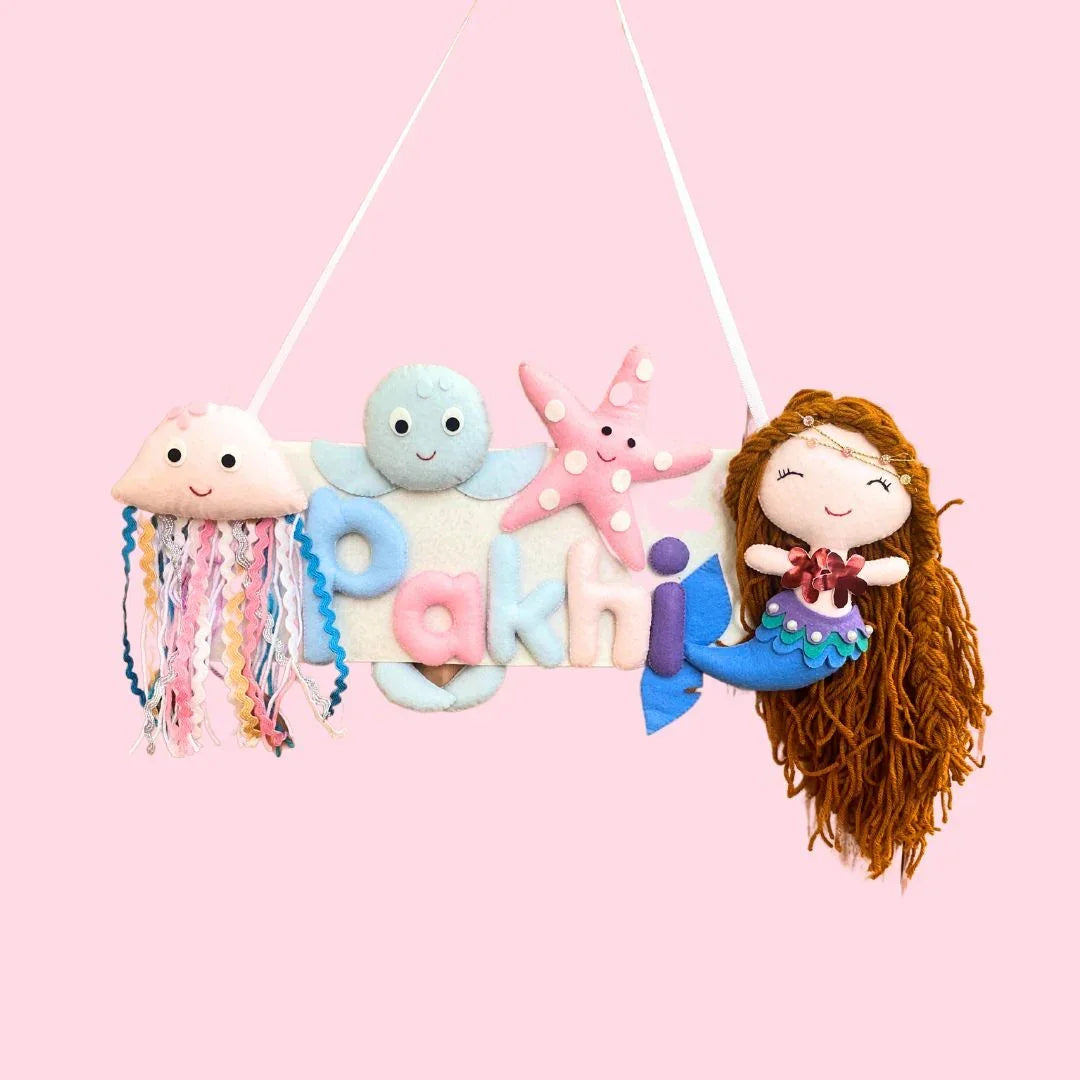 Transform your child's room with our mermaid-themed name plate. Each name plate is carefully crafted on wooden board and customized with your child's name in a whimsical font, complemented by charming felt ocean life characters. Dive into the magic of the sea and inspire your child's imagination with this personalized decor.