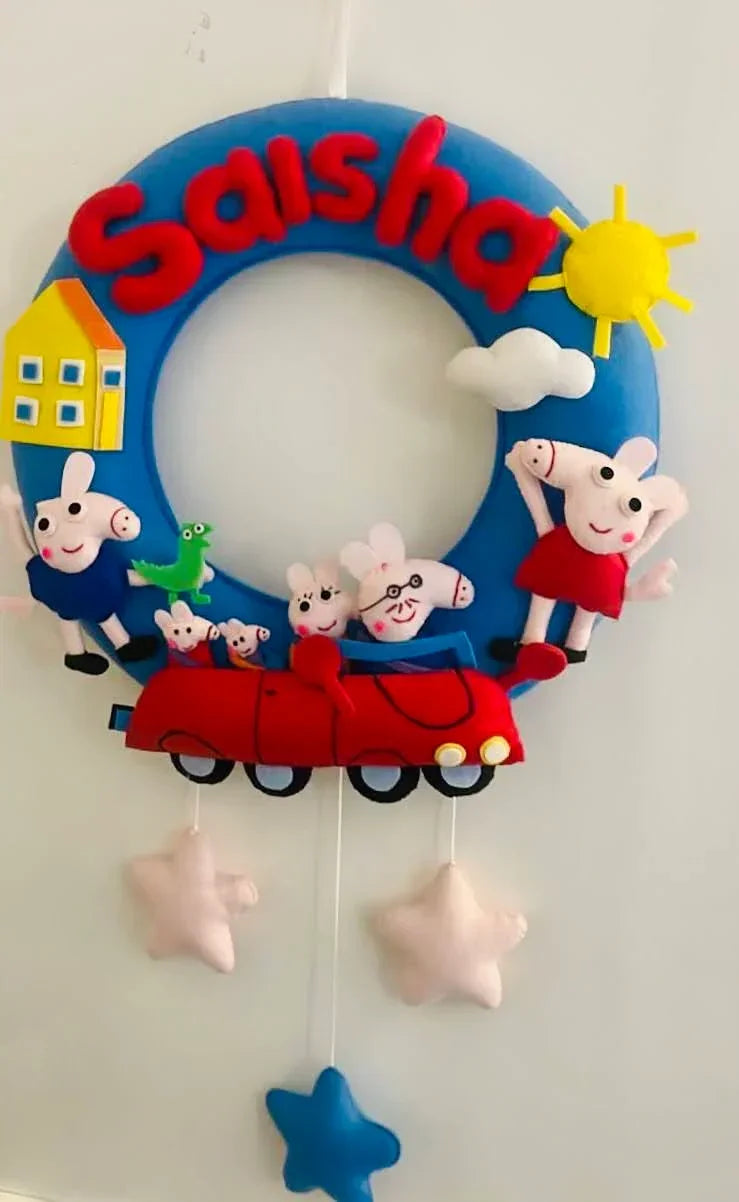 "Personalized name hanging ring featuring beloved Peppa Pig characters.