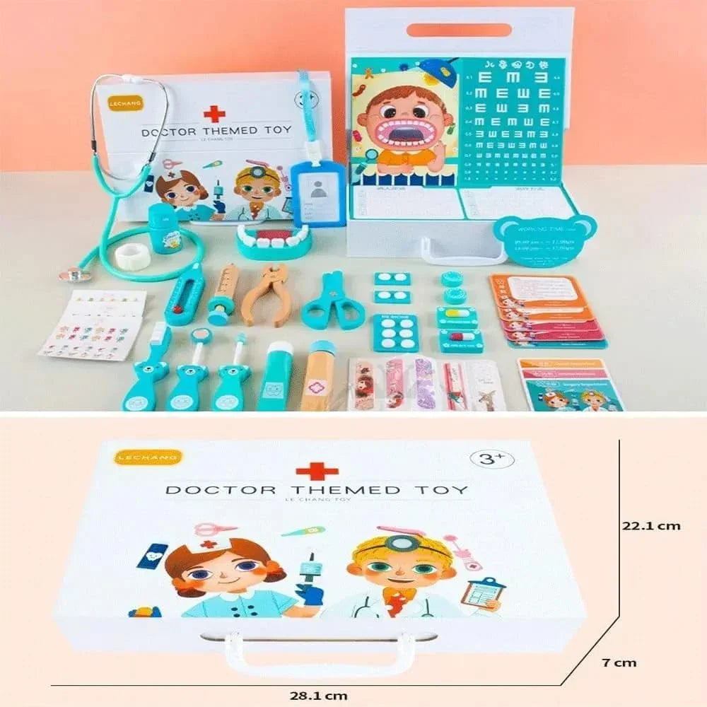 The LeChang Doctor Themed Toy Set is a thoughtfully designed wooden medical playset that brings both fun and learning into your child’s playtime. This doctor-themed kit includes essential medical and dental tools, a stethoscope, an eye chart, medical cards, and more, offering a complete pretend play experience. Crafted with durable wooden components, this playset not only sparks creativity but also builds essential social and cognitive skills in children aged 3 years and above.