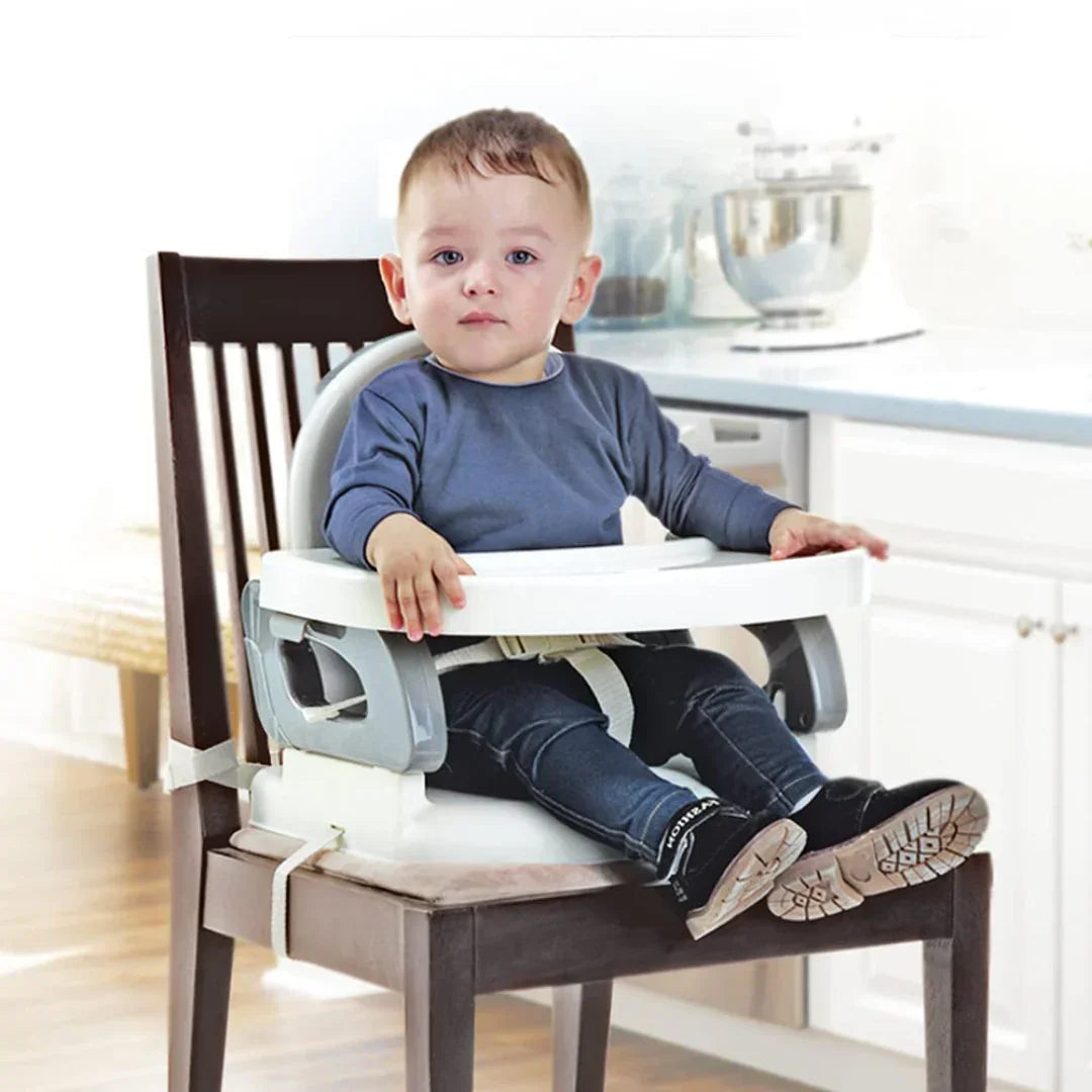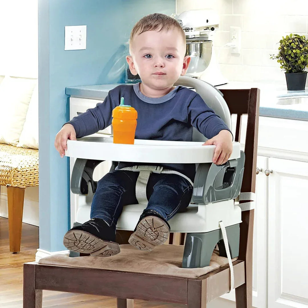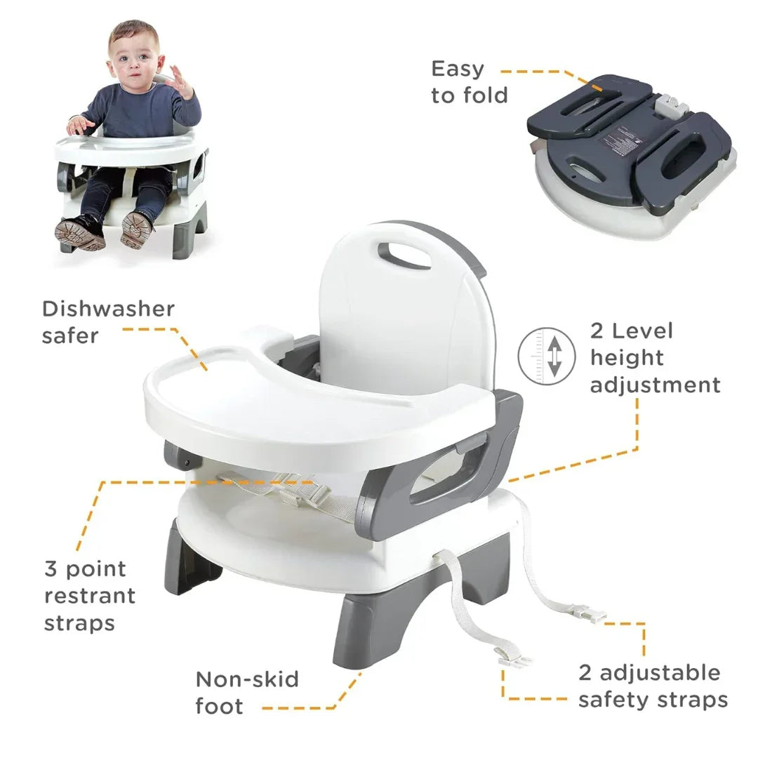 Mastela Folding Booster Seat – Grey (Model 7330) | Adjustable Height, 3-Point Safety Harness, Dishwasher-Safe Tray, Compact Folding Design for Infants 6M+