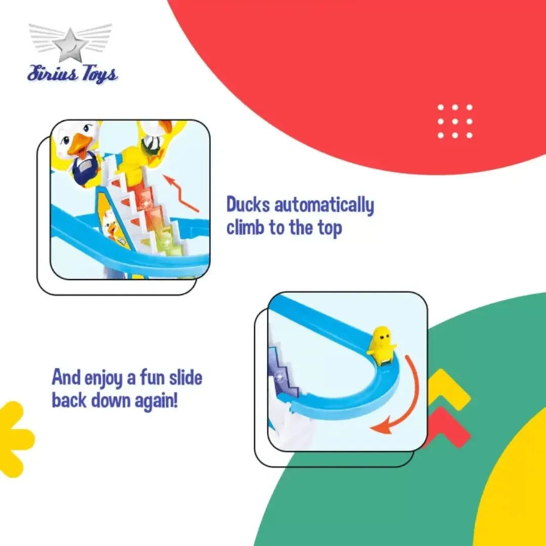 Introducing our Duckling Track Set with Lights & Music! These lovable ducklings eagerly climb stairs, slide down, and climb back up for endless amusement. With captivating lights and music, it becomes a truly enchanting experience. The on/off switch allows you to control their movement, while the easy assembly and durable plastic construction ensure lasting enjoyment. Proudly Made in India, this delightful track set is a perfect addition to any playroom. Bring joy and imagination to your child's playtime with our Duckling Track Set. Order now and embark on a delightful adventure!