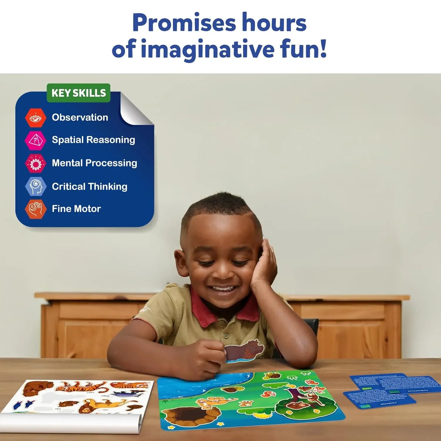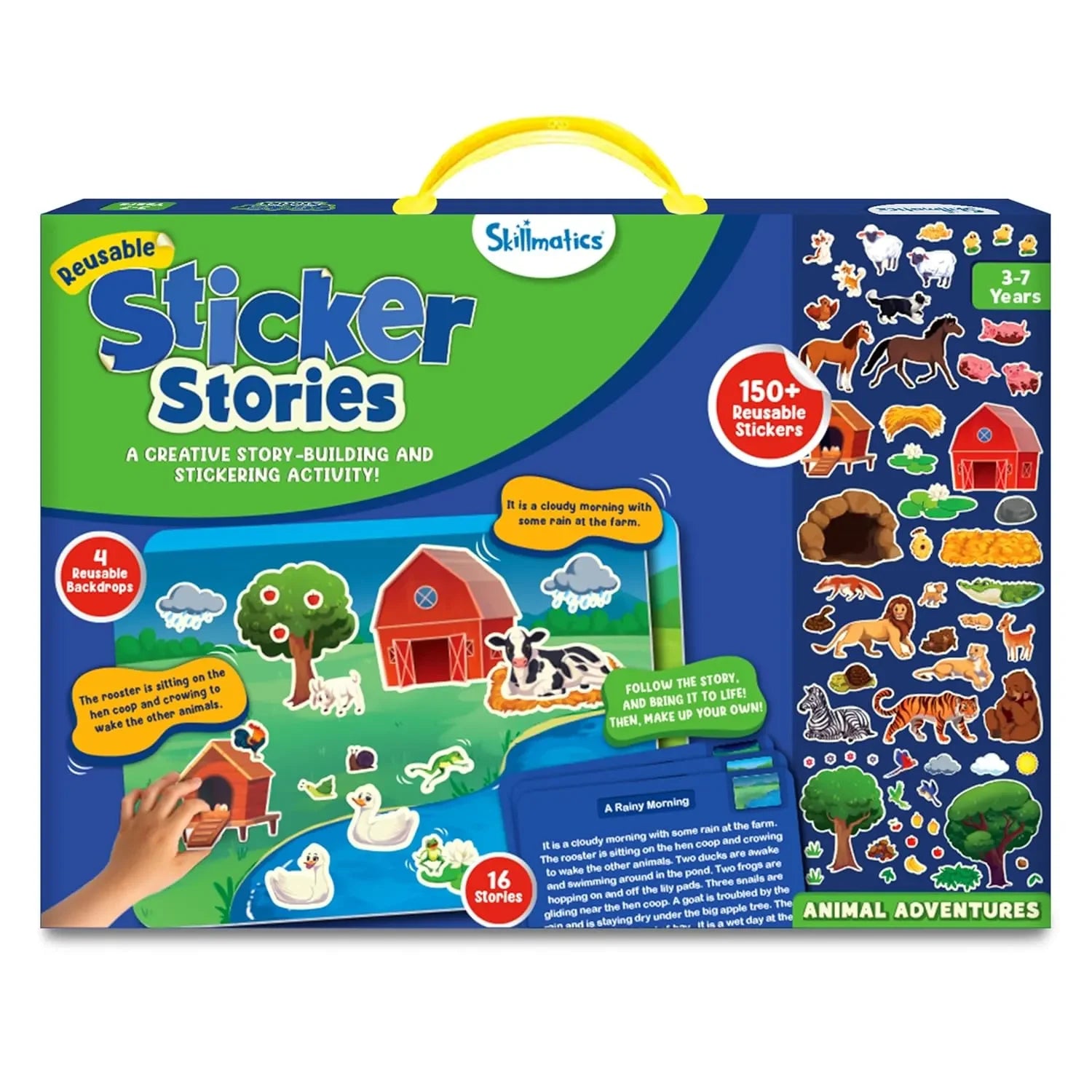 Unleash your child's storytelling potential with the Skillmatics Reusable Stickers – Animals activity kit — a thoughtfully designed, mess-free, and travel-friendly creative playset that blends fun with learning. This all-in-one set encourages young learners to engage in imaginative storytelling through tactile interaction using vibrant, repositionable stickers. With 150+ reusable stickers, 16 engaging animal-themed stories, and 4 durable, double-sided backdrops, children can dive into hours of interactive, screen-free play. Whether at home, on the go, or during quiet time, this kit is perfect for developing early literacy, sequencing, comprehension, and fine motor skills through guided narrative play.