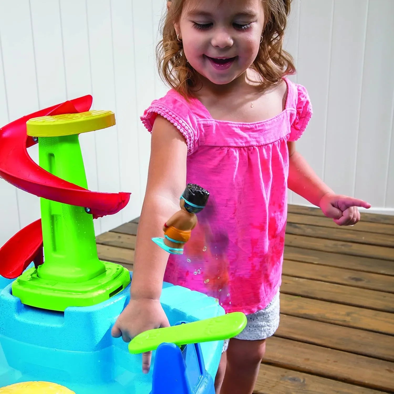 With its realistic cruise ship design, this play table invites children to explore and invent stories, dig for “hidden treasure” in the sand cove, and activate a rain shower effect by pouring water into the upper deck, triggering cascading streams below. The spiral slide adds kinetic water fun, as kids send their toy passengers splashing into the water basin.