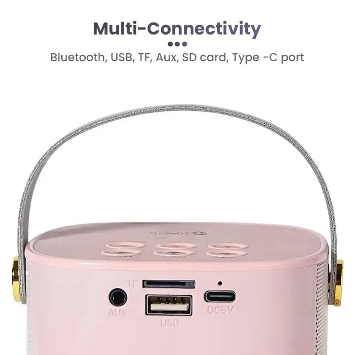 With its included karaoke microphone, the Toreto Tor-375 Jukebox turns any space into a live stage, complete with fun voice-changing effects for a playful twist. Bluetooth connectivity allows you to pair your smartphone, tablet, or laptop seamlessly, while multiple input options let you plug in your music however you like. A robust built-in battery delivers up to 6 hours of non-stop playtime, supported by Type-C fast charging so the fun never has to wait. Whether you want to sing along, amplify your playlist, or simply enjoy superior audio performance, this speaker is built to entertain. Perfect for teens, adults, and families alike, the Toreto Tor-375 is your all-in-one music solution.