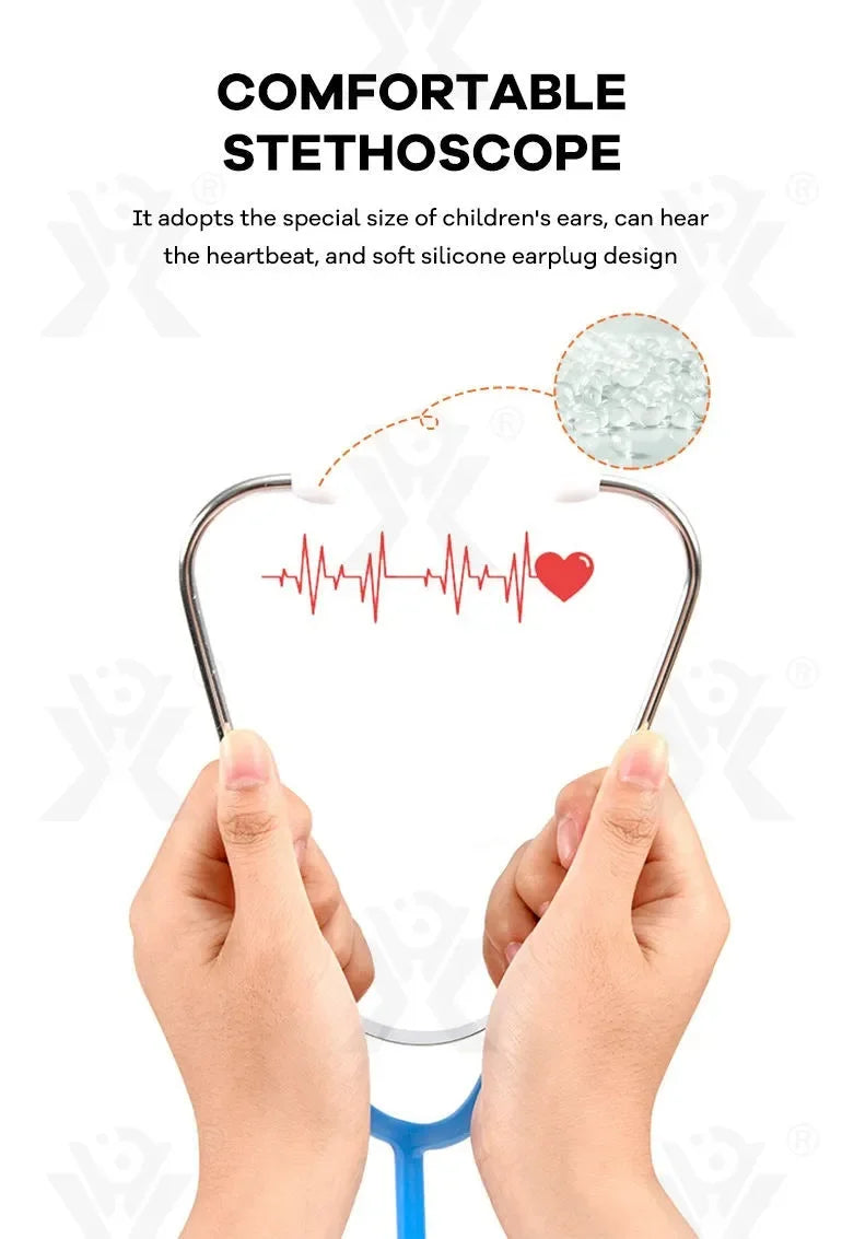 our Wudly Doctor set- Dental kit Stethoscopes-that works you can hear sound of the heart beat, A Doctor Specs, Thermometer with various 4 temperatures, Ointments ,Medical certificate, Mirror and instrument, Plücker, Jaw with detachable teeth Forceps , Rescue card , Letter pad and pencil, Tooth brush Injection , Band-Aid , Tablets A Bag
