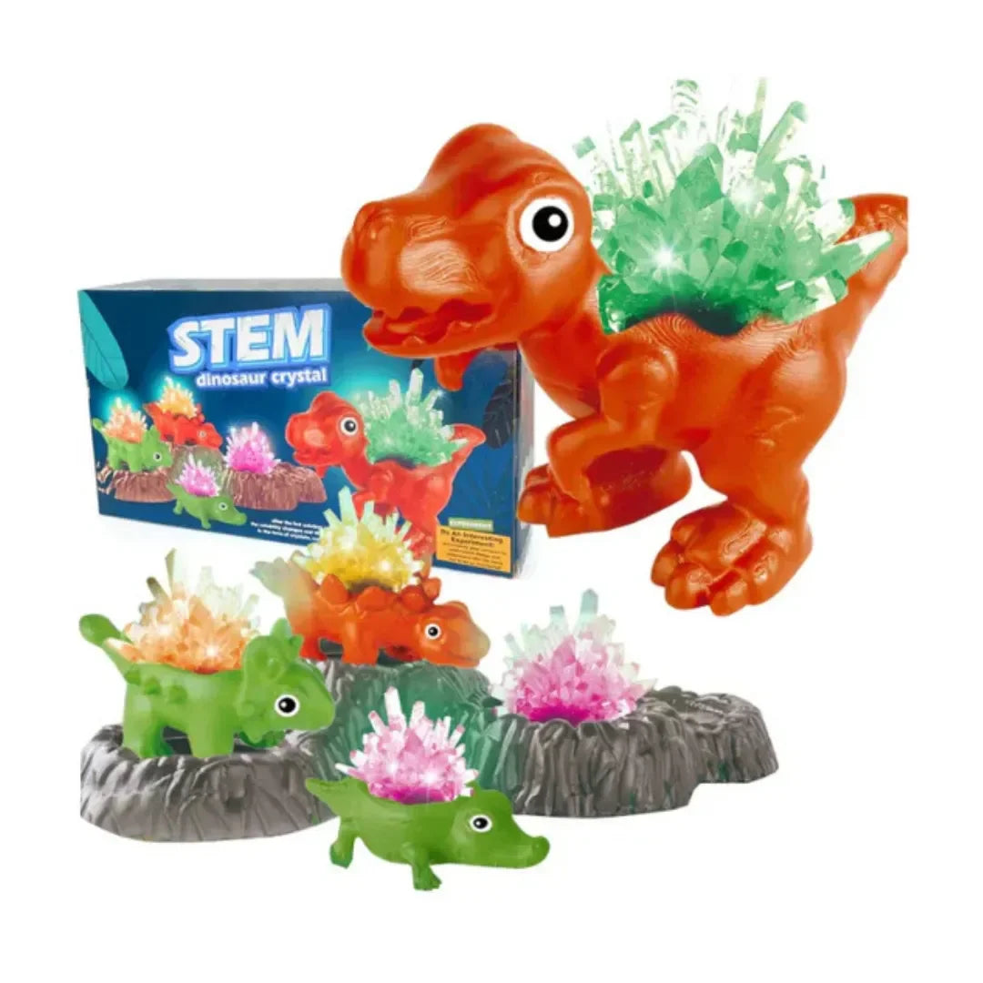 🧪 4-Color Dinosaur Crystal Growing Kit – Includes orange, pink, yellow, and green crystals matched with fun dino bases: Crocodile, Stegosaurus, Tyrannosaurus, and Triceratops.