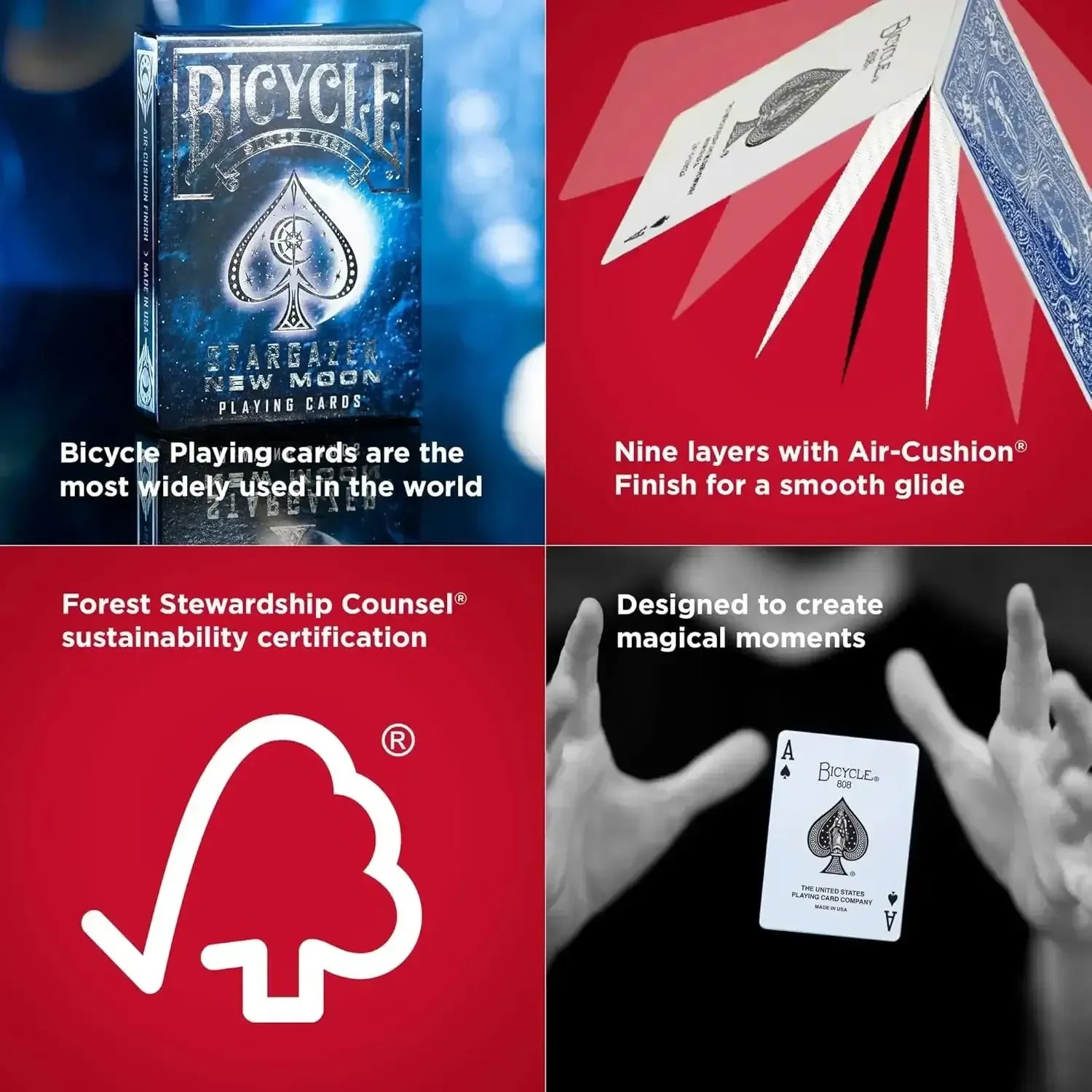 Whether you're a casual player, cardist, magician, or collector, the Stargazer New Moon deck is designed to impress. Printed in the USA using high-quality Bicycle brand cardstock, and finished with the brand’s Classic Air-Cushion Finish, this deck offers superior handling, durability, and ease of use. The custom pips and contrasting suits enhance playability while offering a distinctive, cosmic aesthetic that stands out on the table.