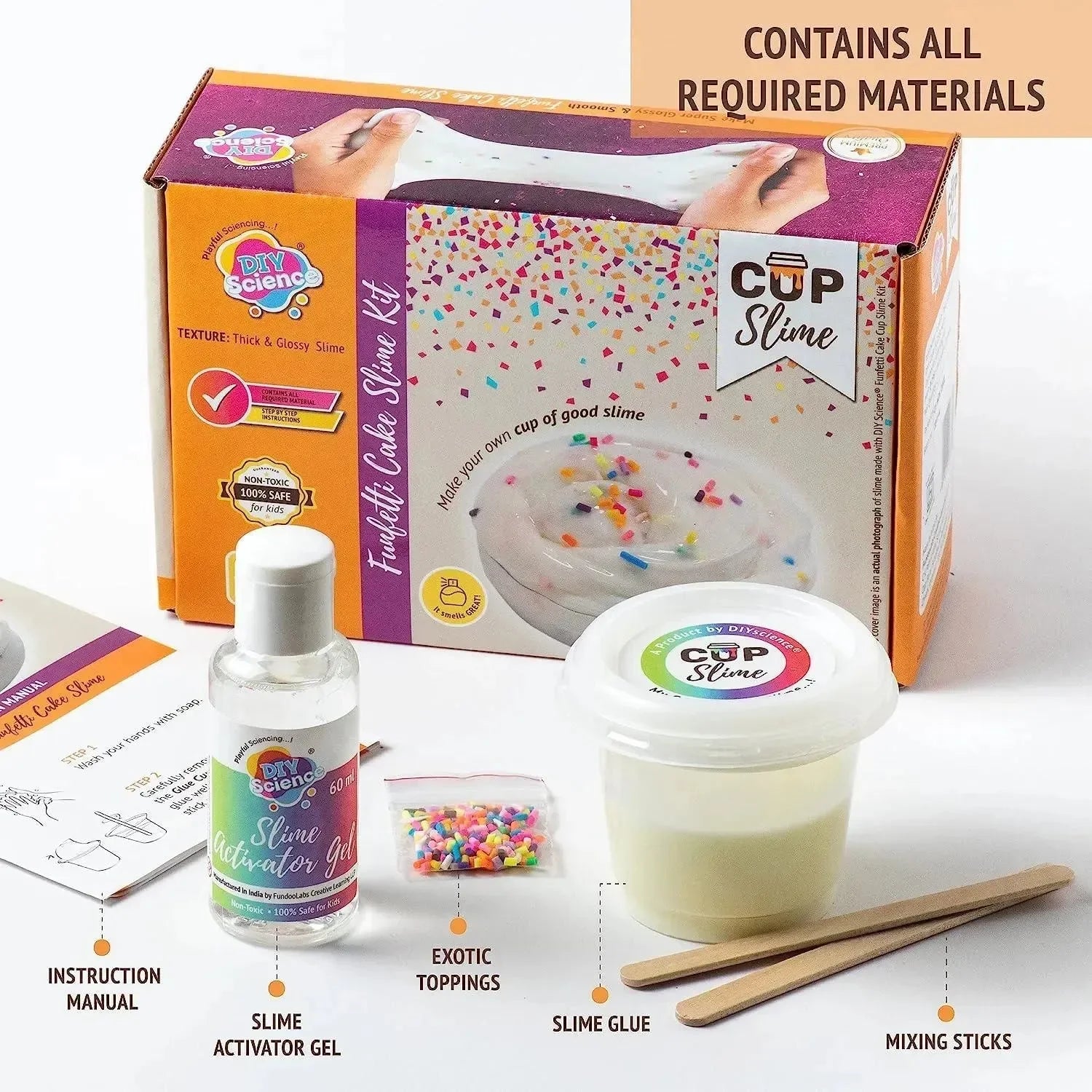 Create thick, glossy, and cake-scented slime with the DIYScience® Funfetti Cake Slime Kit. This all-in-one kit includes colored and scented PVA glue, activator gel, funfetti toppings, and more. Perfect for kids ages 8 and up, it's great for birthdays, science experiments, and creative play. Our high-quality, non-toxic materials ensure safety and eco-friendliness. The user guide provides tips, tricks, and scientific insights, while promoting sensory skills, creativity, and cognitive development. Unleash your imagination with this STEM toy and indulge in the world of funfetti cake slime!