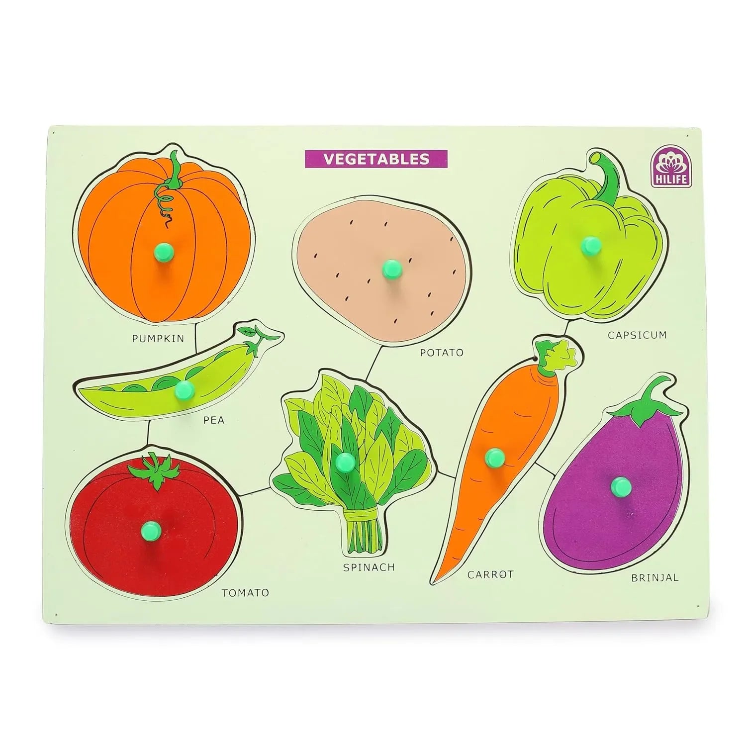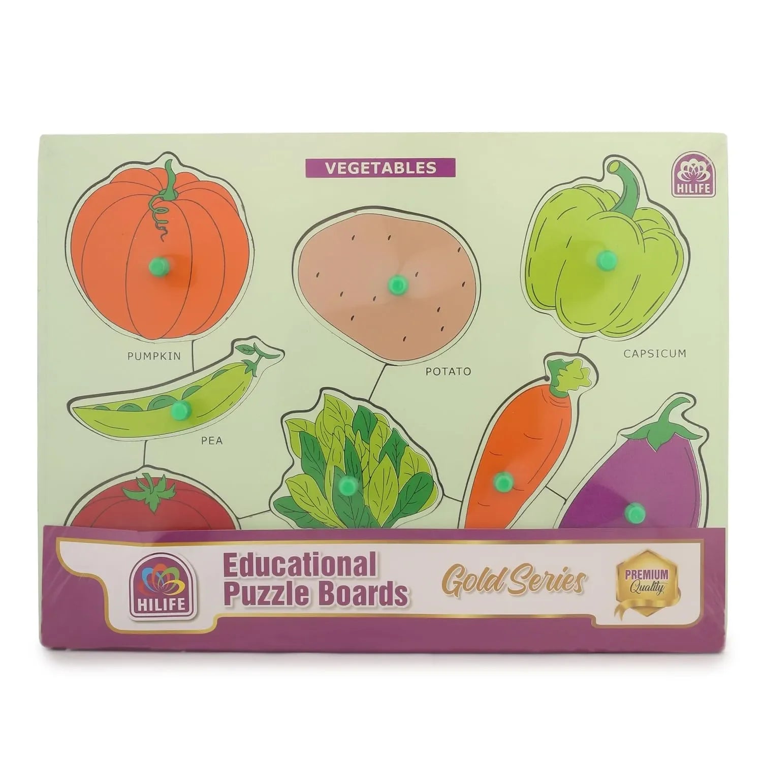 Introduce your child to the colorful and healthy world of vegetables with the HiLife Educational Vegetables Puzzle Board, part of the Gold Series of early learning toys. This wooden peg board is specifically designed for toddlers and preschool-aged children, providing an interactive and hands-on way to learn about different vegetables while also boosting essential developmental skills. With vibrant illustrations and chunky wooden pieces shaped like familiar vegetables such as carrots, tomatoes, and capsicums, this puzzle board helps young children recognize common veggies and understand their significance in a fun, engaging format. Each vegetable piece is fitted with an easy-to-grip peg that allows small hands to grasp, lift, and fit the piece into its designated spot, promoting hand-eye coordination, shape recognition, and fine motor development.