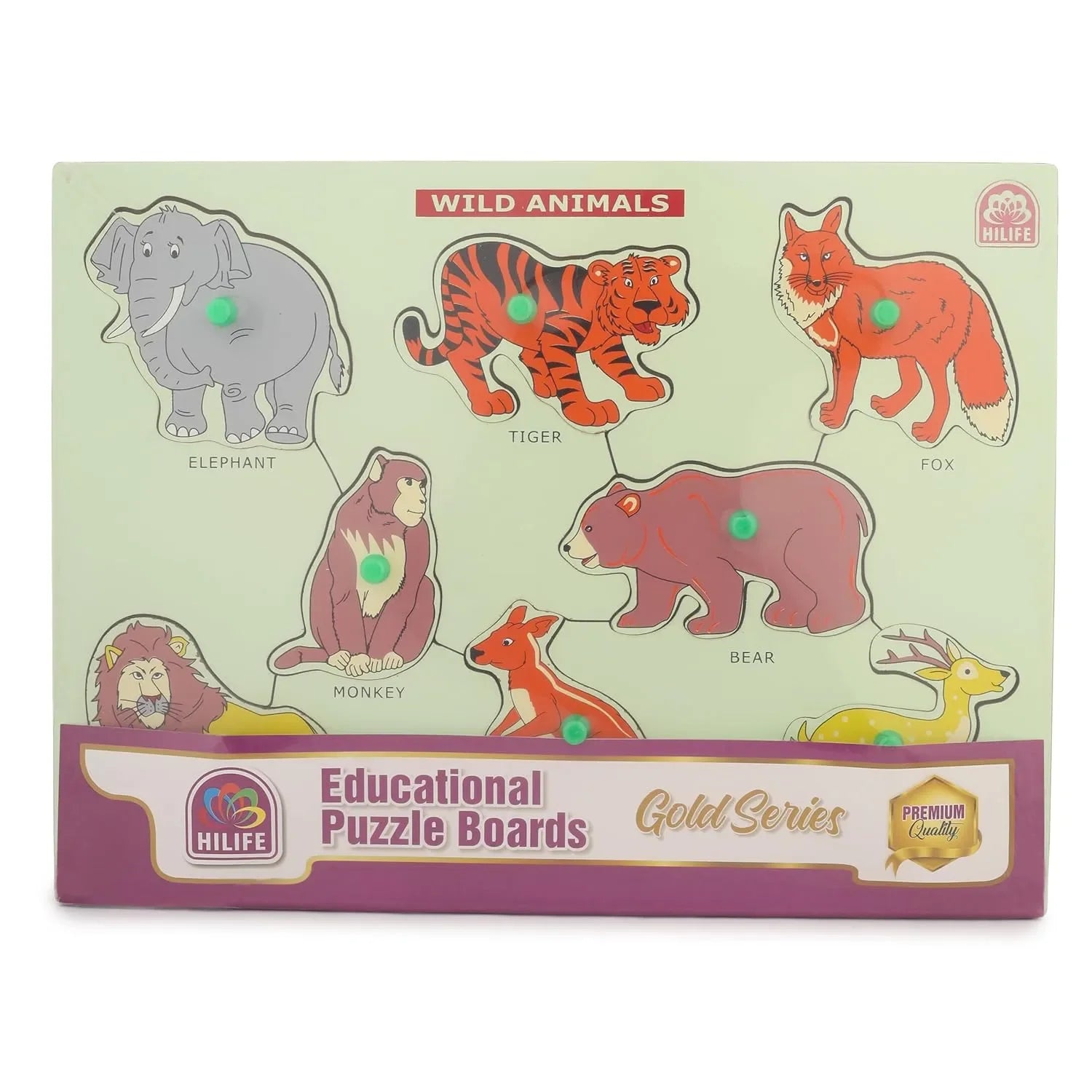 • Wild Animals Peg Puzzle Board: Features a collection of popular wild animals such as lion, elephant, giraffe, zebra, and more to build early recognition skills.