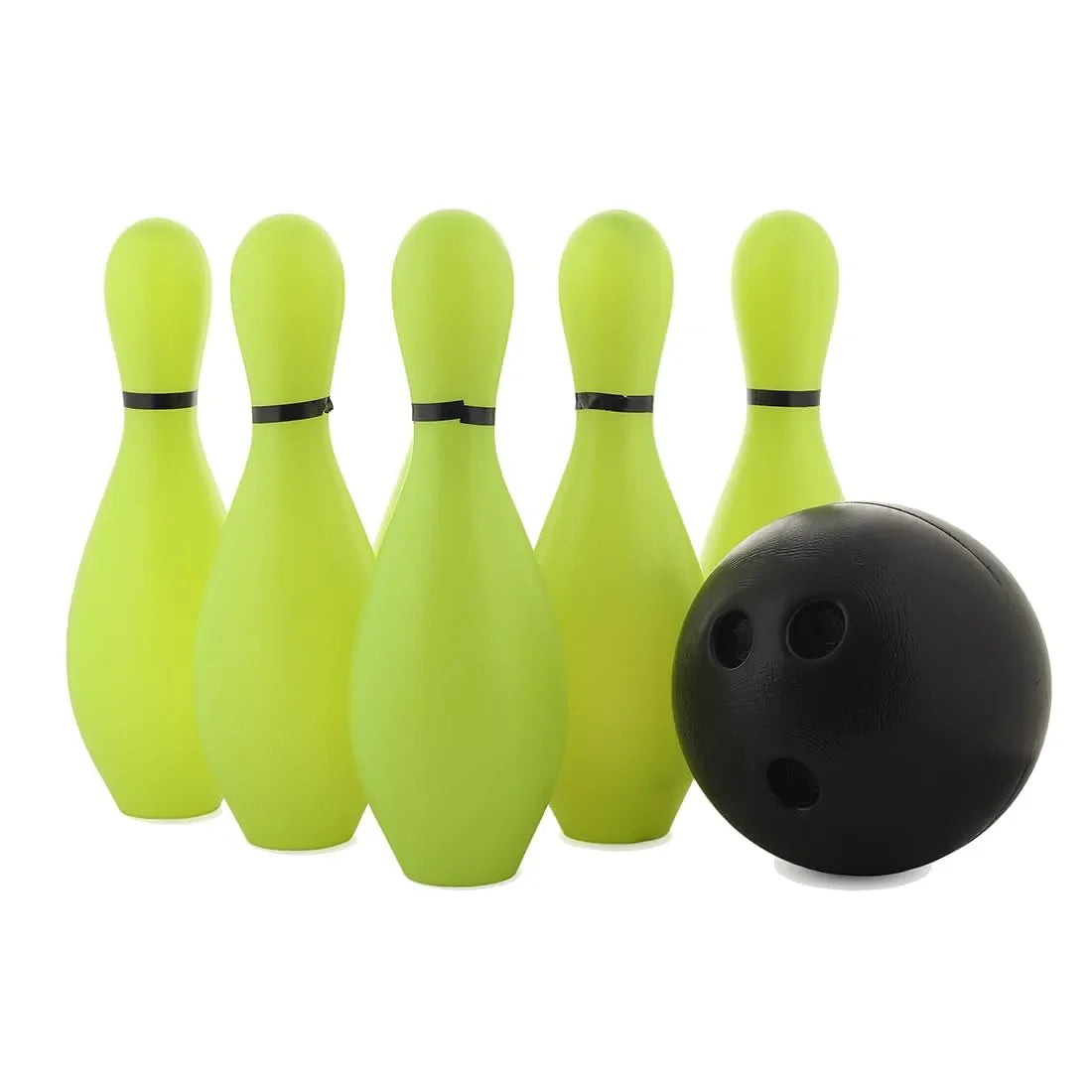 • Complete Bowling Set for Kids: Includes 5 vibrant neon green pins with black detailing and 1 matching black ball.
