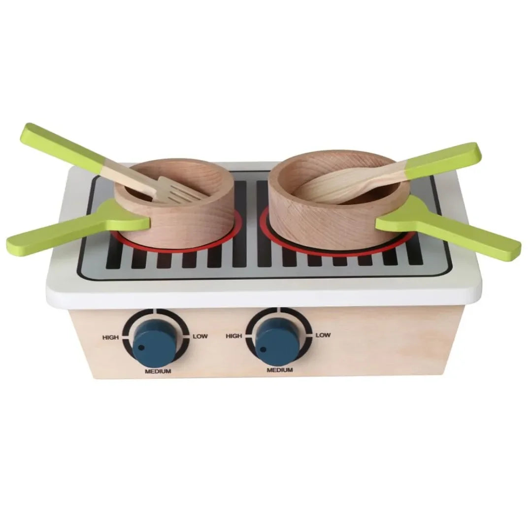 Hilife Mini Gas Stove Kitchen Set | Wooden Pretend Play Cooking Toy for Kids Age 3+ | 2 Pans, 2 Spatulas, Switches – Multicolor