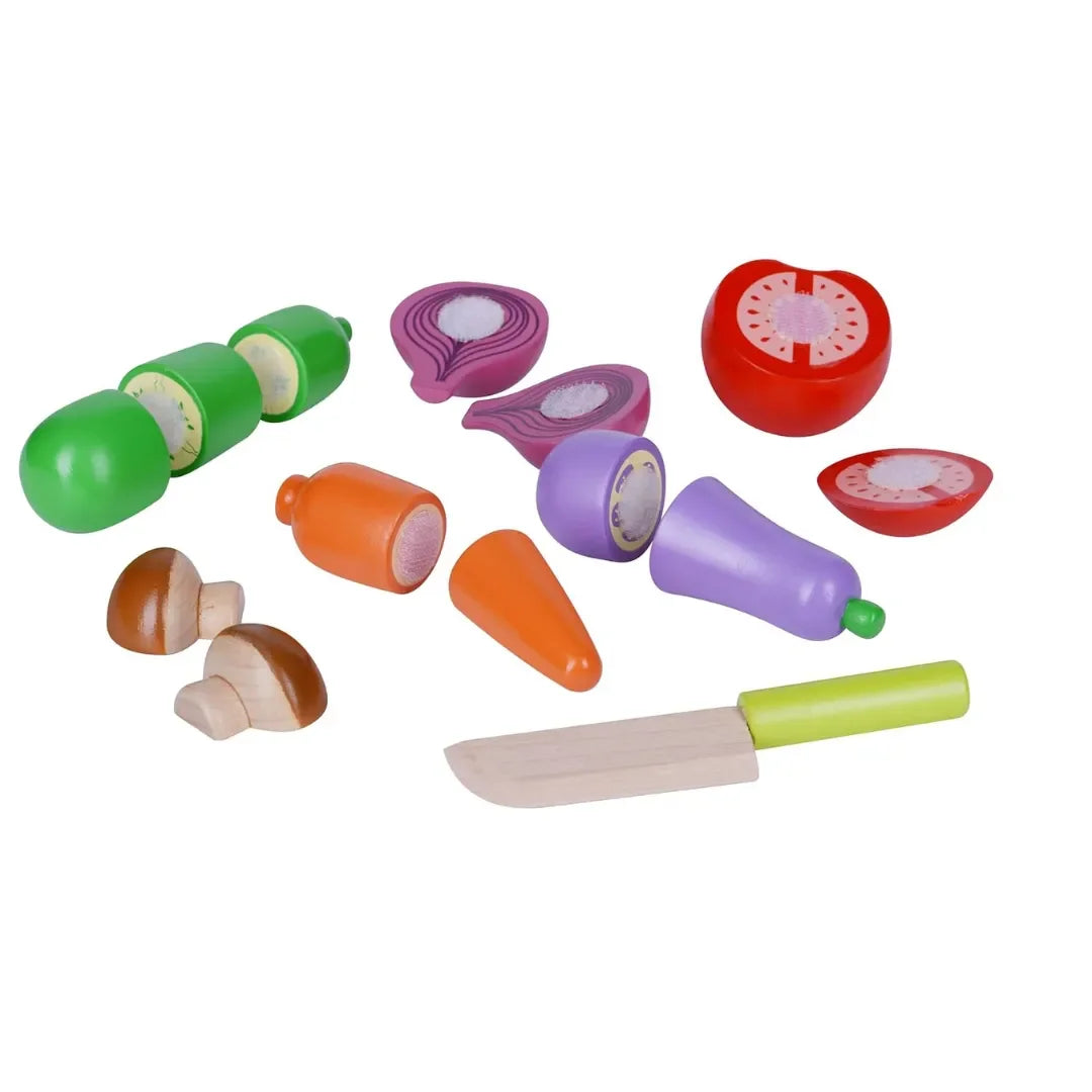 Includes multiple colorful food items such as tomato, onion, carrot, mushroom, and more, along with a durable wooden knife for pretend chopping practice.