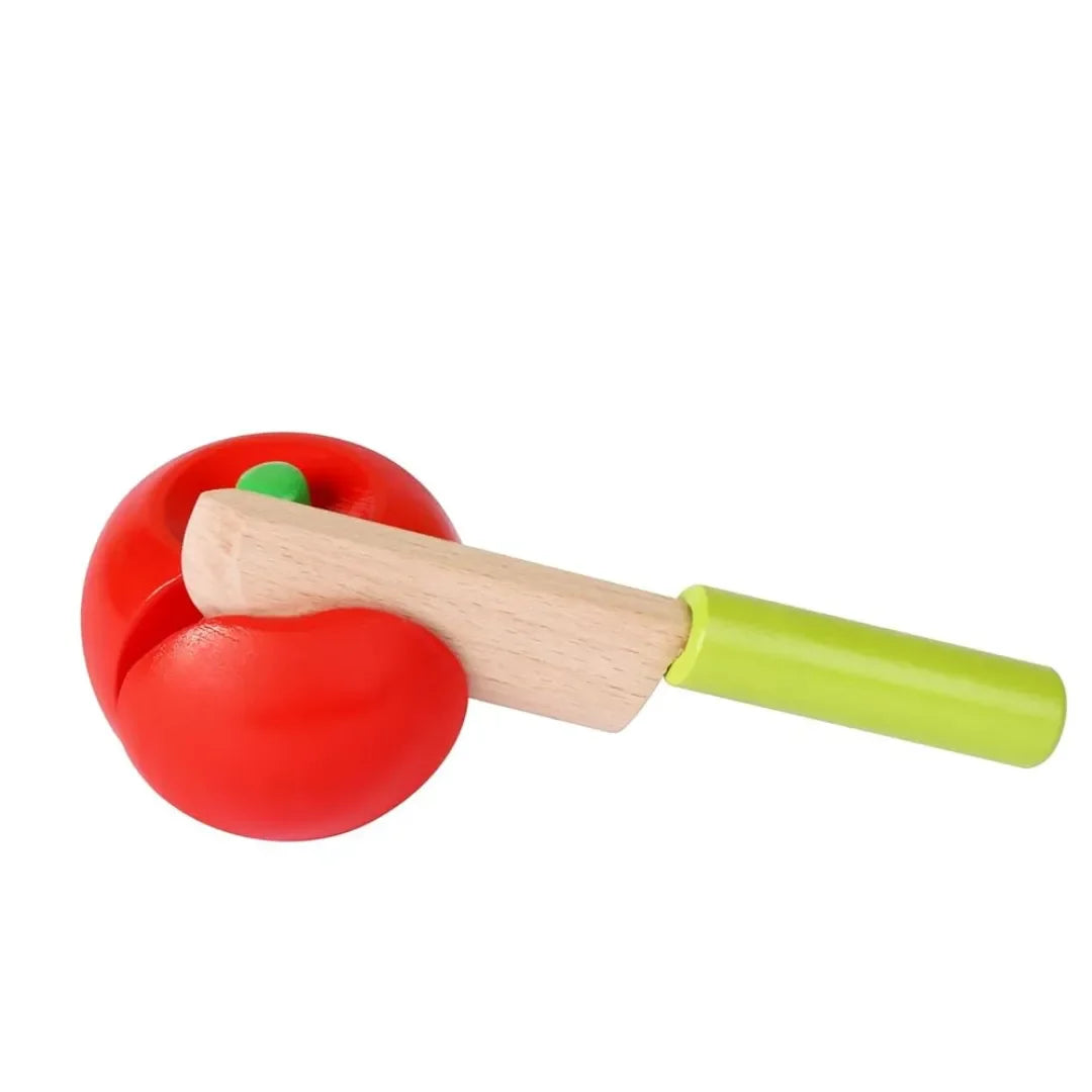 Each food item is made of wood and held together with hook-and-loop fasteners, allowing children to "slice" them with a wooden toy knife—just like in a real kitchen!