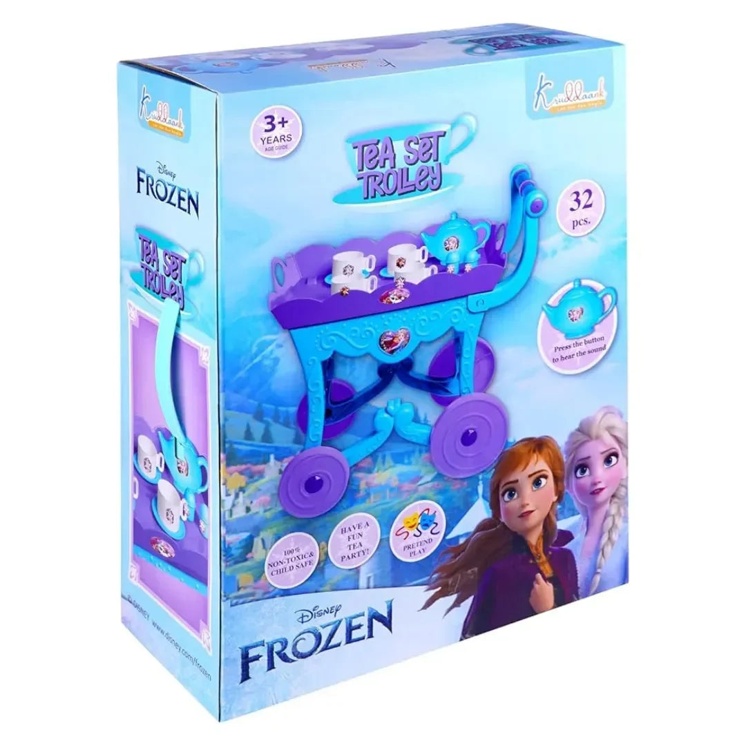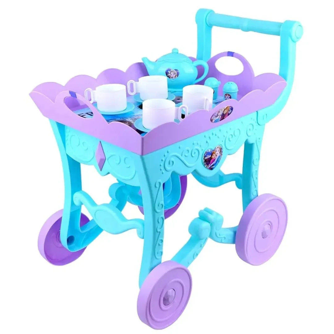 The Kriiddaank Frozen Tea Trolley 32 Pcs Set is a delightful playset designed to make every tea party magical for kids. This charming mini tea trolley, complete with smooth-rolling wheels, allows children to serve tea or carry their toys with ease, fostering independence and imaginative play. The set includes 32 pieces, featuring a trolley, cups, saucers, a teapot, sugar bowl, creamer, plates, and 20 assorted pretend food items, all crafted with realistic details and vibrant colors. Made from safe, BPA-free plastic with smooth, rounded edges, it ensures durability and safety during playtime. Perfect for preschoolers aged 3 and up, this set encourages role-playing, hand-eye coordination, and social development, making it an ideal gift for birthdays, holidays, or any special occasion.