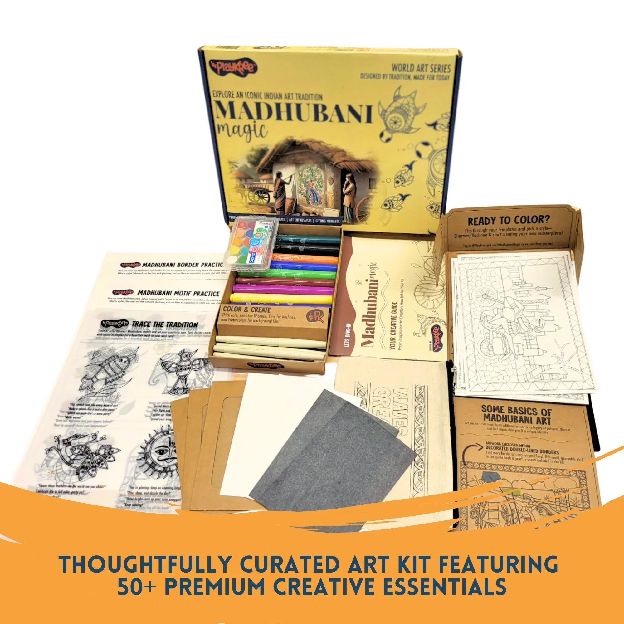 Inside, you’ll find authentic Madhubani designs, premium-quality materials, and easy practice sheets - everything thoughtfully curated to help you create beautiful, soulful art with your own hands.