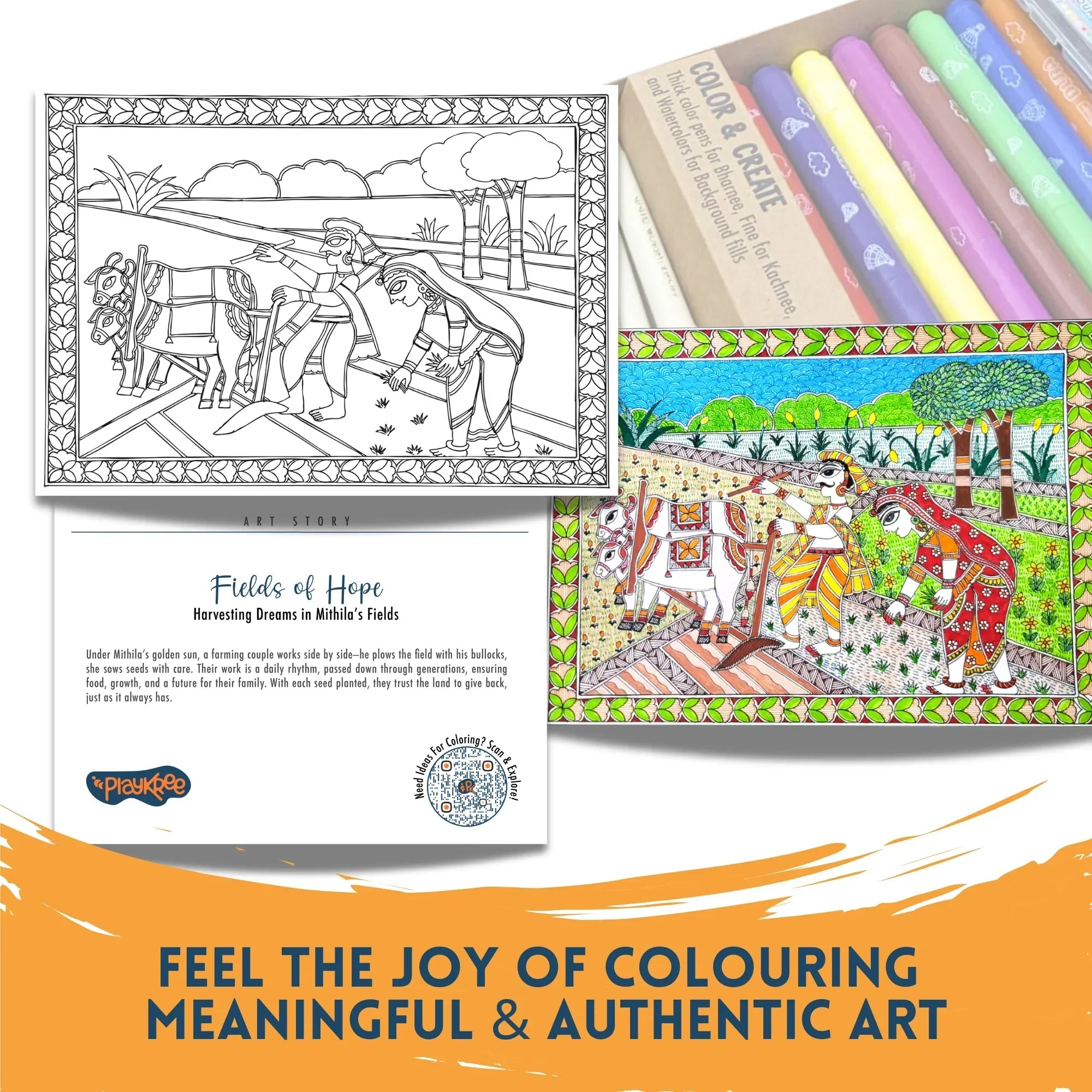 • 6 Authentic Madhubani Designs – Artist-created templates to color and personalize.