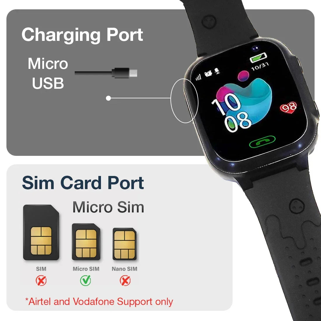 "1) 2G Smart watch phone voice calls – Just insert a SIM (airtel or voda) in this watch and let the child make 2-way audio call to any number directly from the watch. For kids safety,