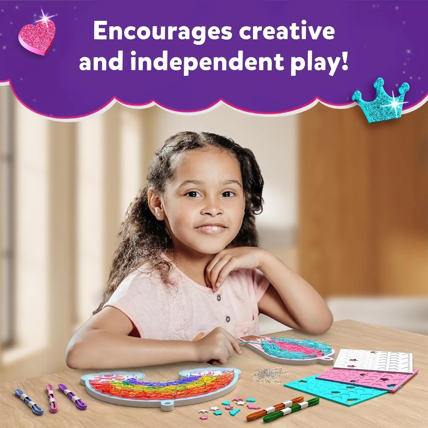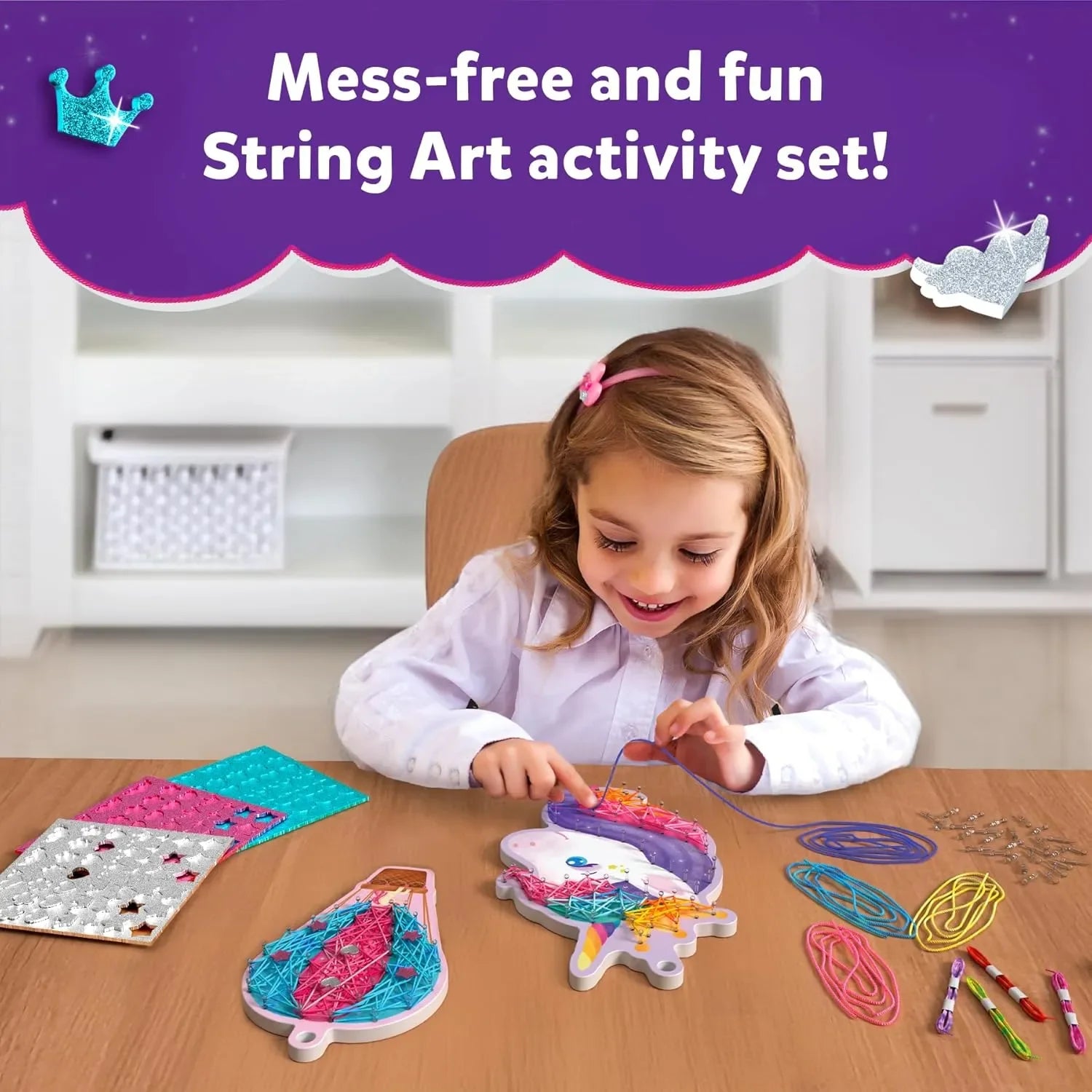 Imaginative DIY String Art Kit for Kids: Create magical artwork featuring a unicorn, hot air balloon, and rainbow with this engaging craft kit designed for children aged 6 to 12 years.