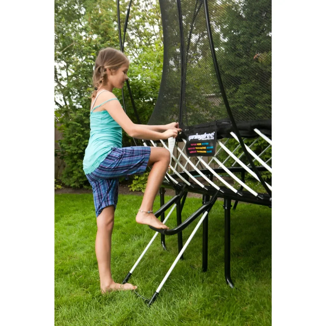 The durable black and white frame complements the modern aesthetic of Springfree trampolines, while the included locking mechanism gives caregivers greater control, allowing them to restrict access when supervision is not available. The locking feature is particularly useful for families with young children, helping prevent unsupervised trampoline use.