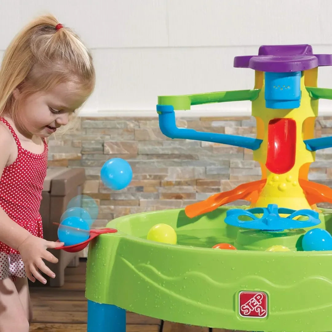 The Step2 Busy Ball Play Table is a one-of-a-kind interactive water playset designed to captivate toddlers and preschoolers aged 1.5 to 7 years by combining the excitement of ball play with the sensory joy of water activities. This unique activity table offers an innovative twist on traditional water tables by incorporating three distinct ball pathways, including a tall tower chute and ramps, along with side flippers to launch balls back into the basin. The centerpiece spinner adds dynamic movement as it swirls the balls around the water, providing endless fun and visual stimulation. Its open design encourages social interaction and cooperative play, making it a perfect choice for playdates or family fun.