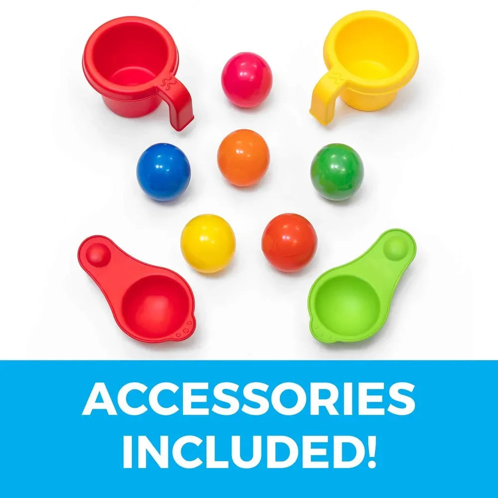Fine Motor Skill Development: Kids practice put-and-take ball play and improve hand-eye coordination by using the side flippers to launch balls and pouring cups to control water flow.