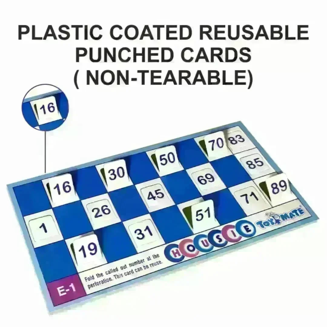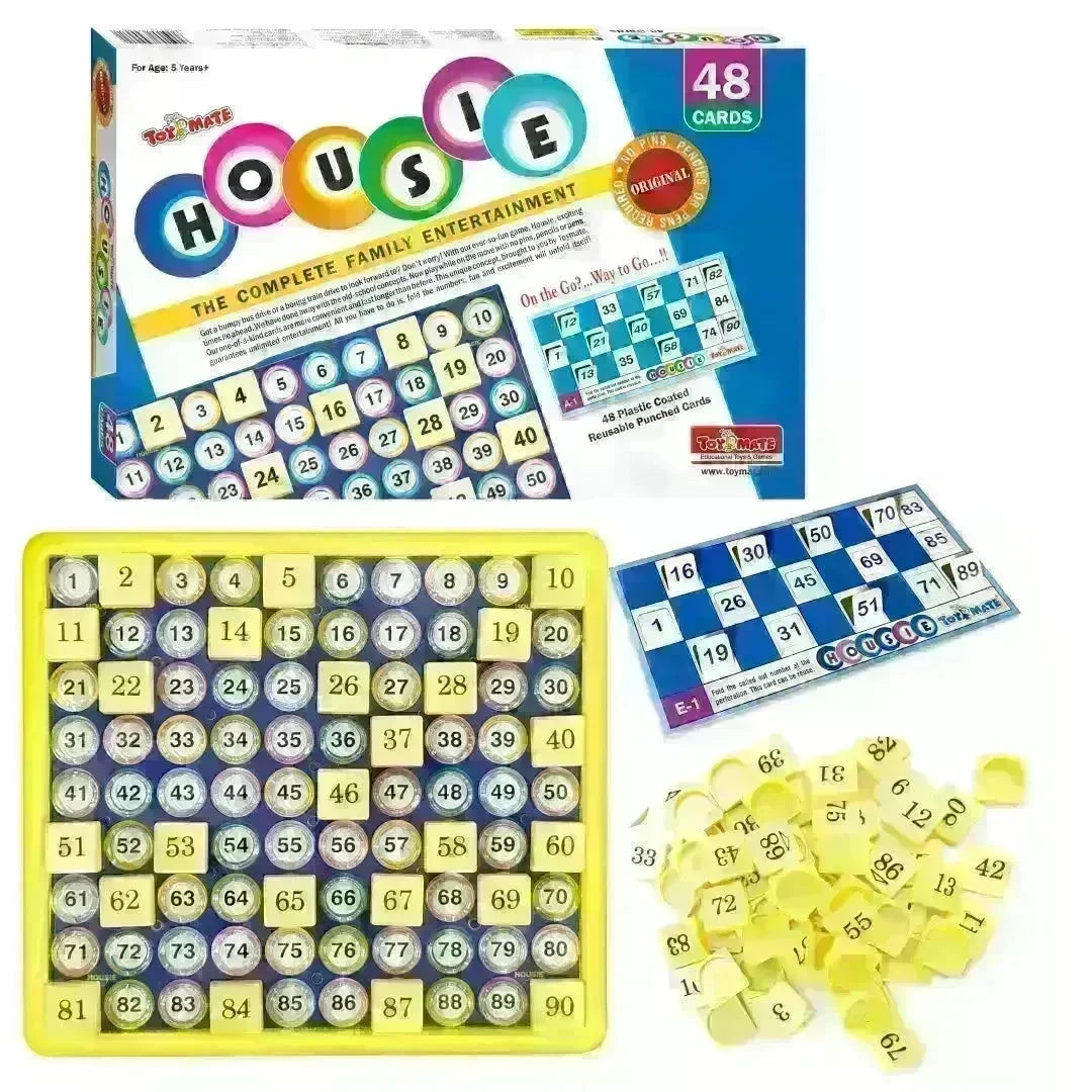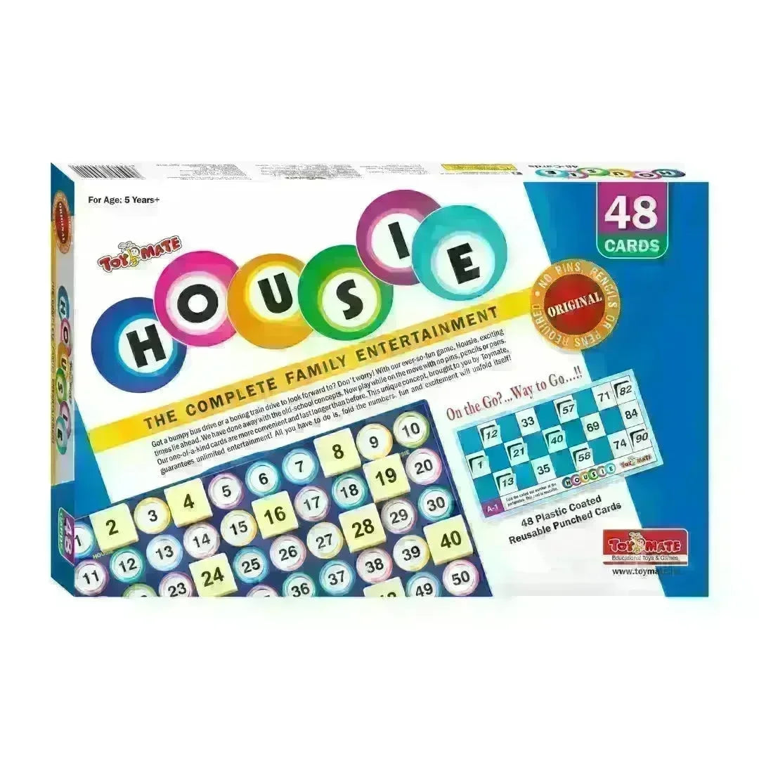 Toymate Housie Blue With 24 Cards is the ultimate travel-friendly game for endless fun on the go! Say goodbye to pins and pens—just fold the numbers on our durable, reusable cards for a hassle-free experience. Perfect for bumpy bus rides or long train journeys, this modern twist on a classic game sharpens the mind, enhances problem-solving skills, and boosts memory. The set includes a playboard, 92 number tiles (with 2 blanks), 48 reusable cards, and an instruction guide printed on the box. Fun, convenience, and excitement guaranteed!