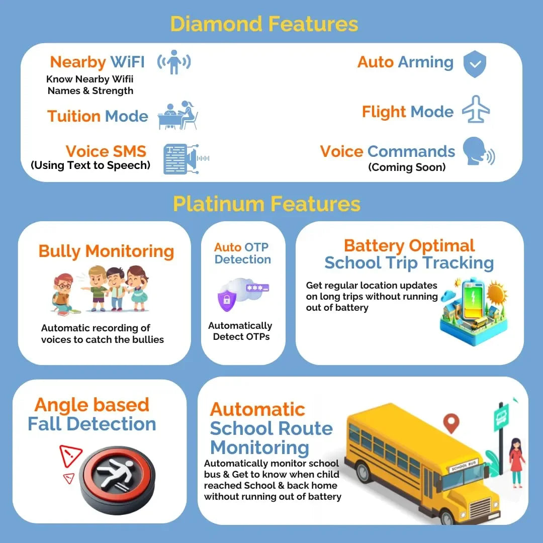 Designed for today's kids and parents, it offers two-way voice and video calling, auto call pick-up, safe messaging, and real-time location tracking via GPS, Wi-Fi, and LBS — even indoors through nearby Wi-Fi networks. Advanced features like Auto Arming for battery optimization, Flight Mode, Tuition Mode, and School Mode deliver better control, longer usage, and improved safety.