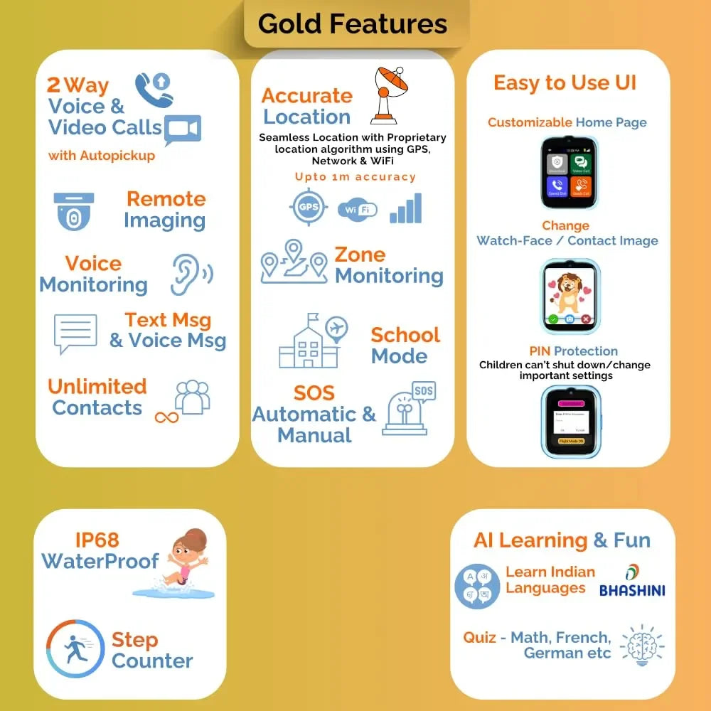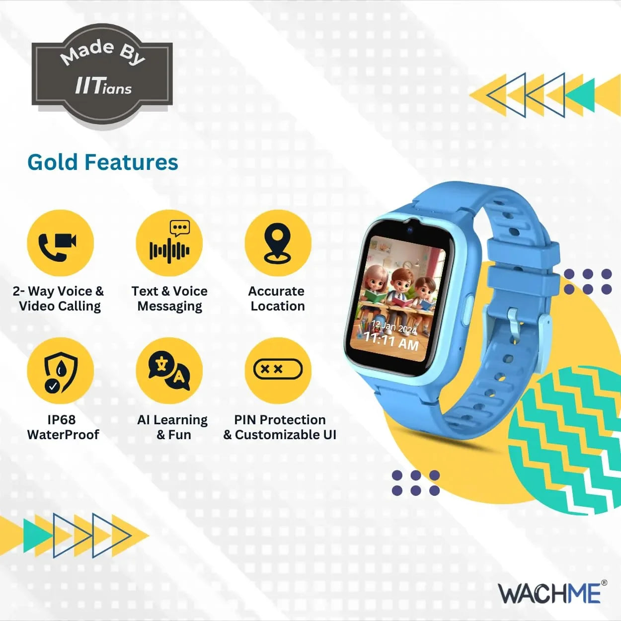 The WachMe 4G Kids Smart Safety WatchPhone WM4GA1 Gold is a next-generation smartwatch thoughtfully designed for security, communication, learning, and privacy. Developed by IITians in India, it runs on WachMe-Wear-OS and is supported by the ad-free WachMeController app (Android; iOS version coming soon).