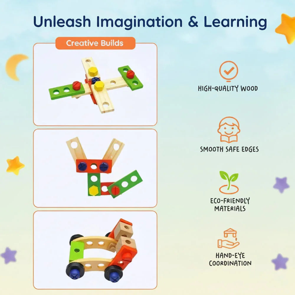 Wudly wooden tool box includes: wooden tool box, instructions, hammer, wrench, saw, ruler, screwdriver, handle, etc. With simulated tools and scenes, children feel like real little carpenters screwing in or tightening wood screws, actively building various toy cars: truck, crane, excavator, roller, forklift, and teach them basic building techniques.