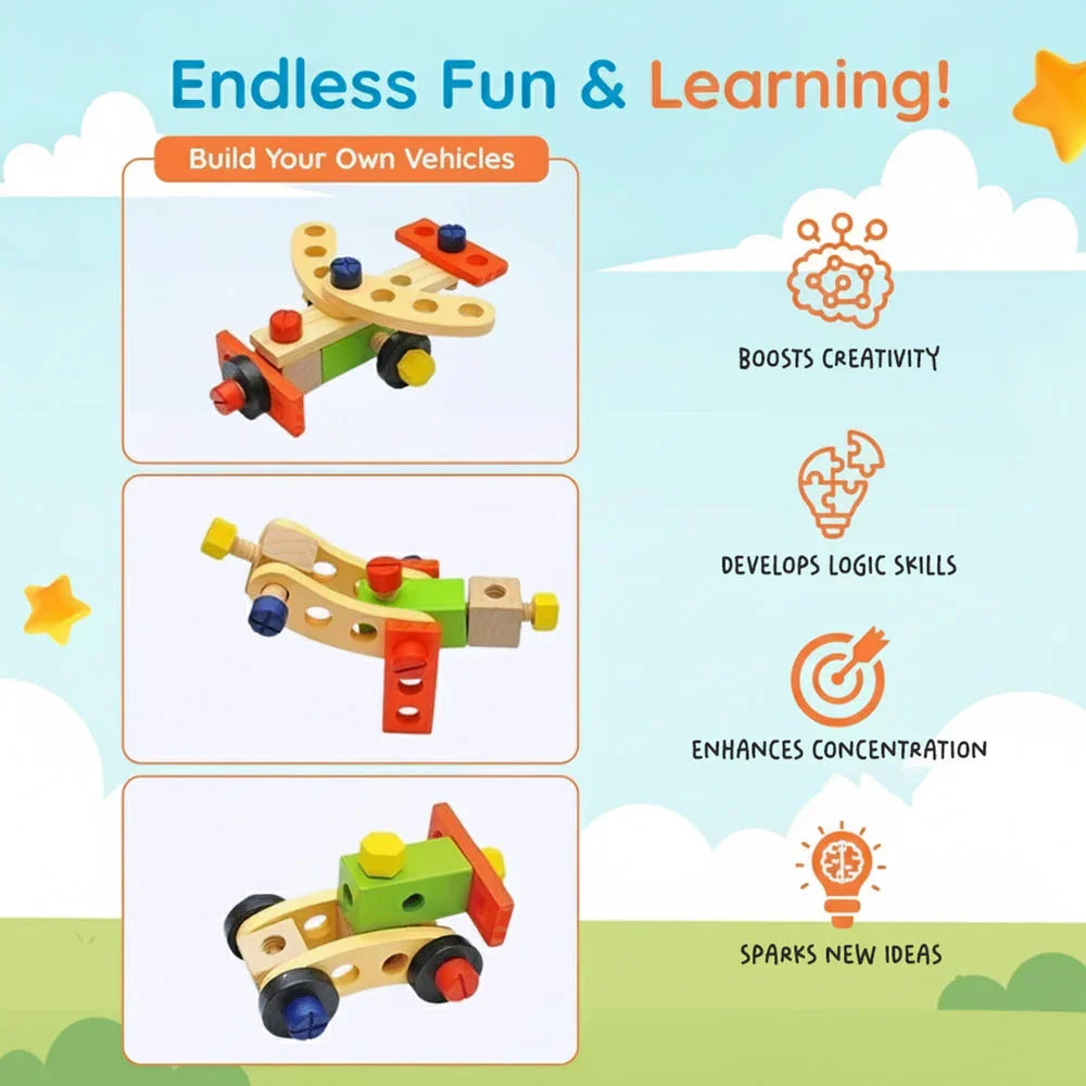 3..  fosters creative play and enhances problem-solving abilities as kids join different parts together with the help of a hammer and screwdriver and design vehicles, windmills, any shape