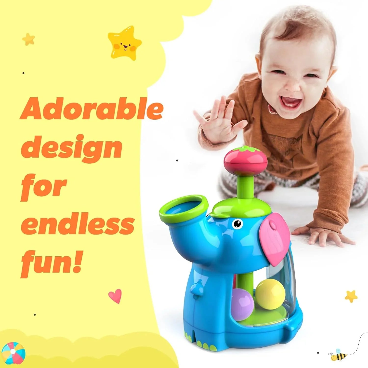 Drop-the-ball play through the elephant’s trunk for engaging visual and motion-based fun