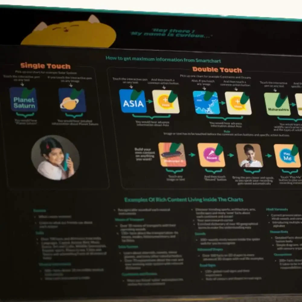 Interactive Smart Learning System: Includes 12 educational charts that come alive through a talking pen. Each chart covers core learning areas such as the Solar System, Human Body, India, Occupations, Seasons, and more.
