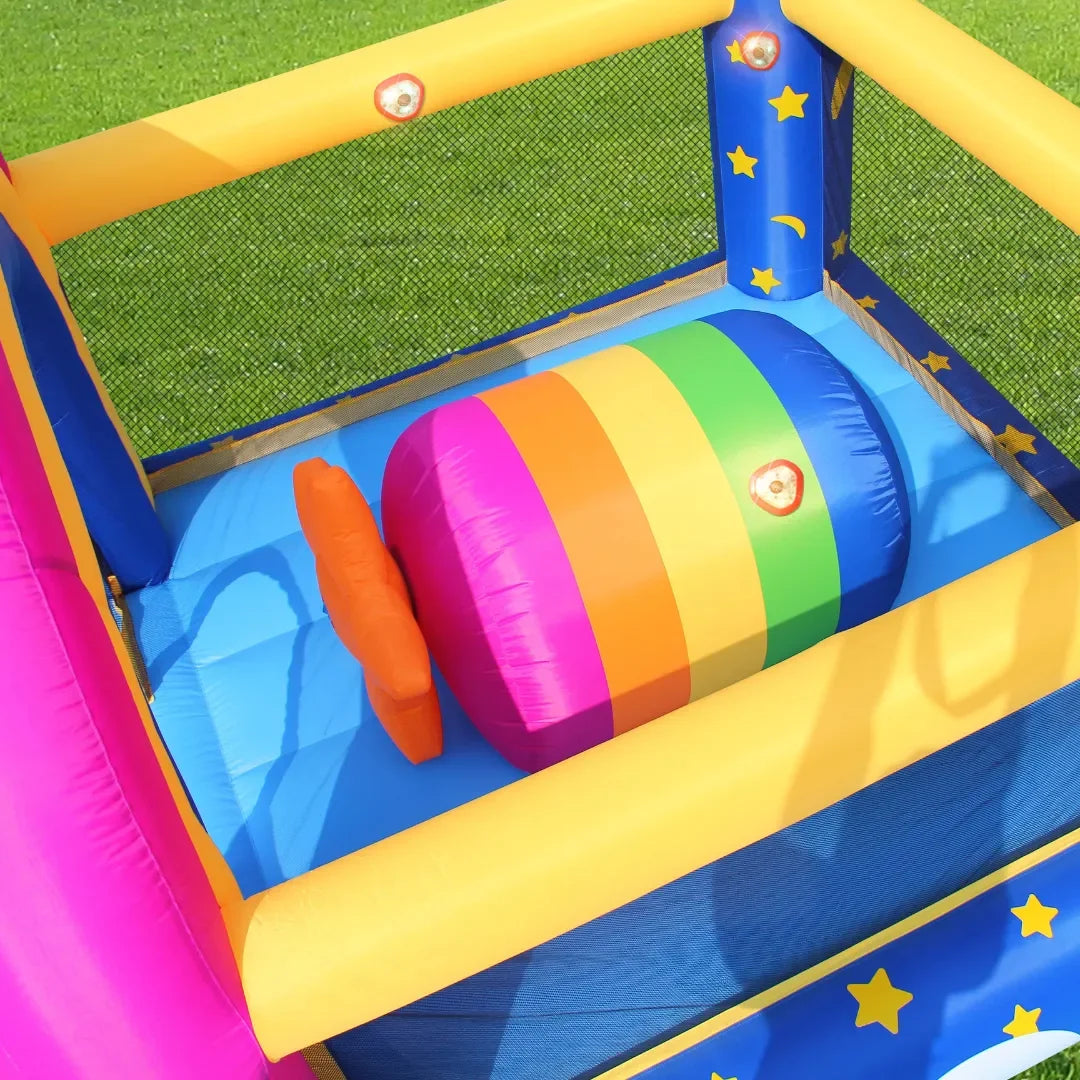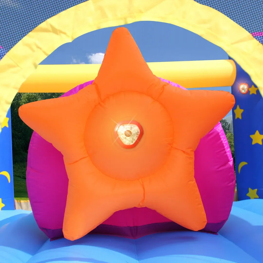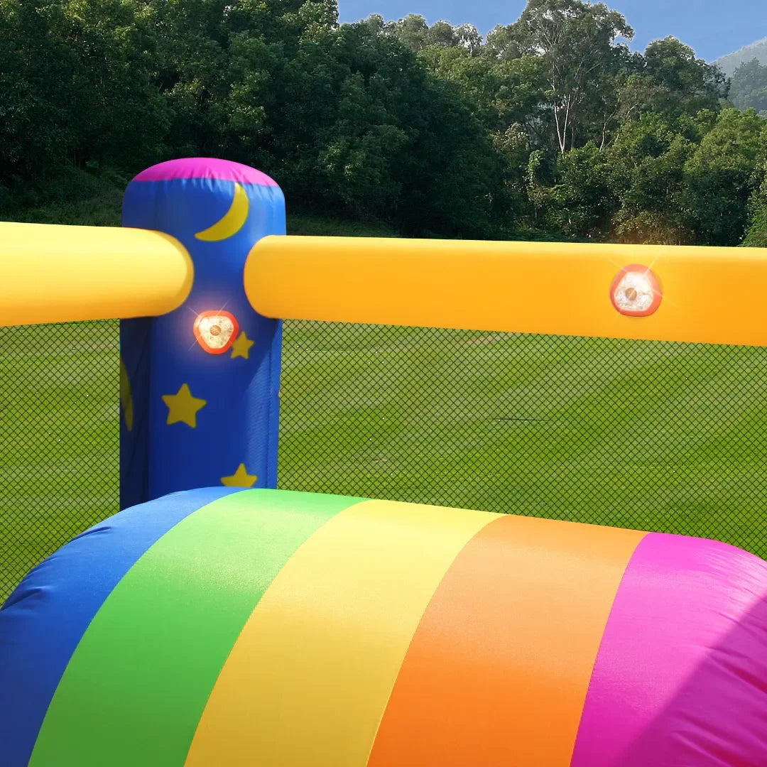 • Rainbow Arch Entrance: The whimsical rainbow archway enhances the magical theme while serving as a wide and welcoming entrance for young jumpers.