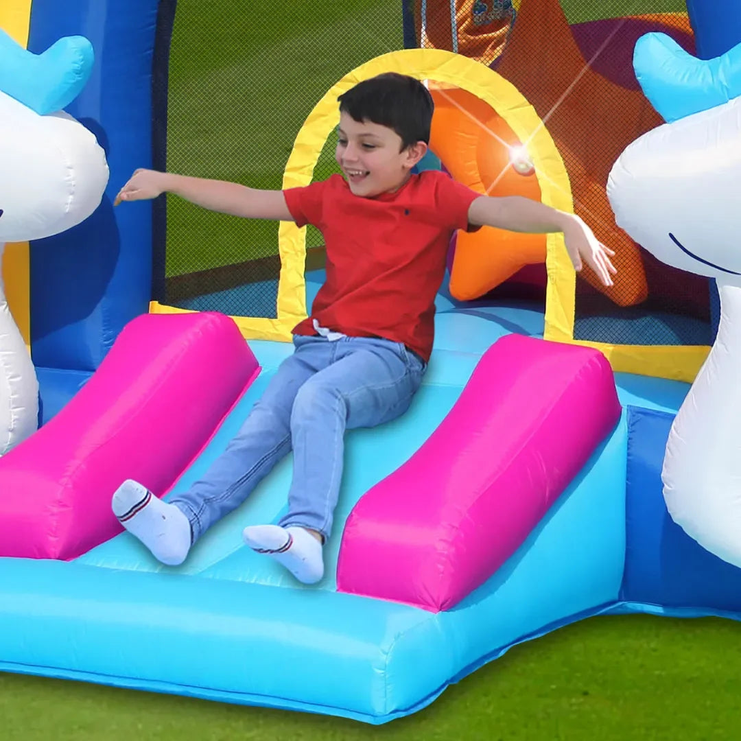 • Unicorn-Themed Inflatable Bouncer: Designed with a delightful unicorn motif and vibrant colors, making playtime more imaginative and visually engaging.