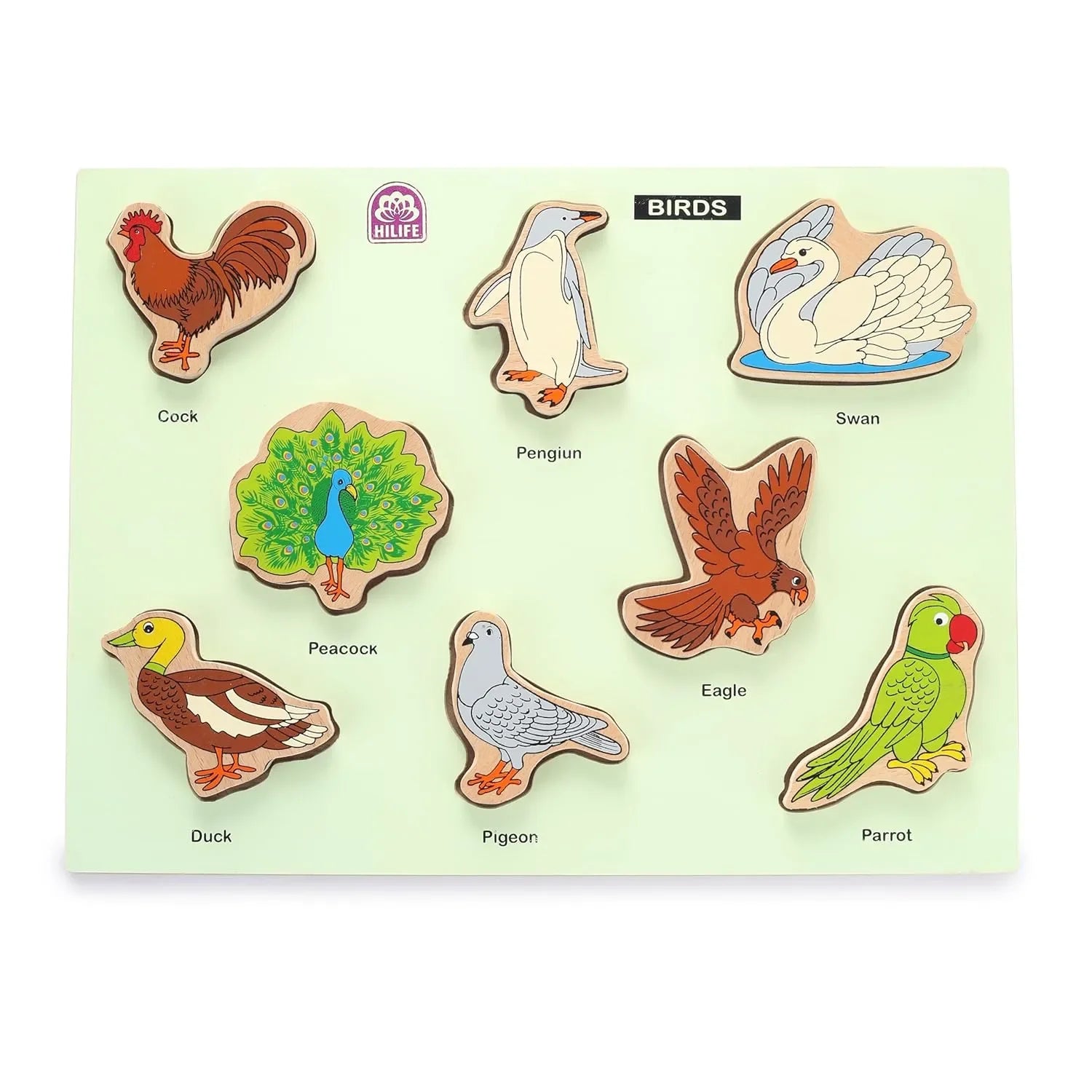 Includes 8 wooden puzzle pieces, each representing a commonly seen bird like a parrot, pigeon, or peacock.