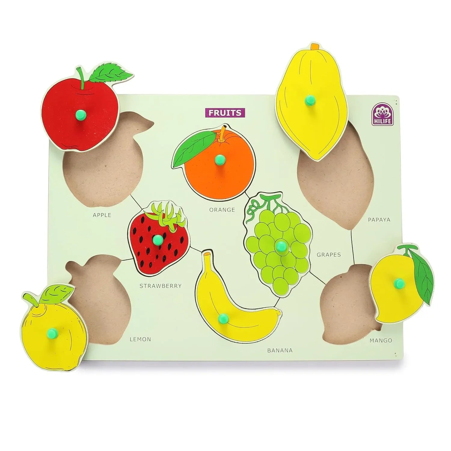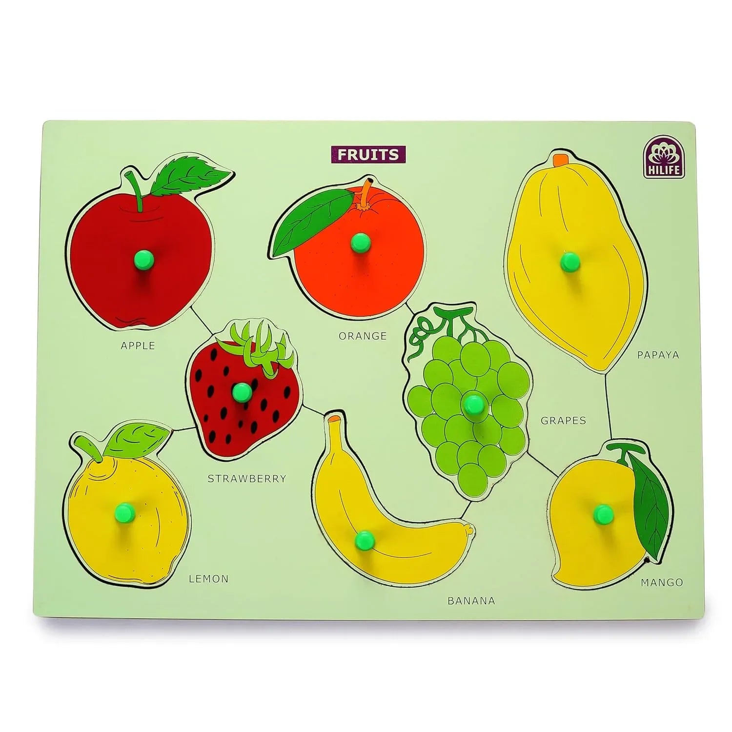Introduce your little one to a fun and interactive way of learning with the HILIFE Educational Fruits Puzzle Board, Gold Series Edition. Thoughtfully designed for toddlers and preschool-aged children, this wooden peg board toy offers a multisensory approach to early education. With vividly illustrated fruit pieces like apple, banana, orange, mango, and more, this puzzle helps children recognize and name common fruits while promoting healthy food awareness from an early age. Each piece features a sturdy wooden knob that allows small hands to lift and place pieces easily, making it ideal for fine motor development. More than just a toy, this puzzle acts as a foundational learning tool that sparks curiosity, sharpens memory, and encourages independent thinking.
