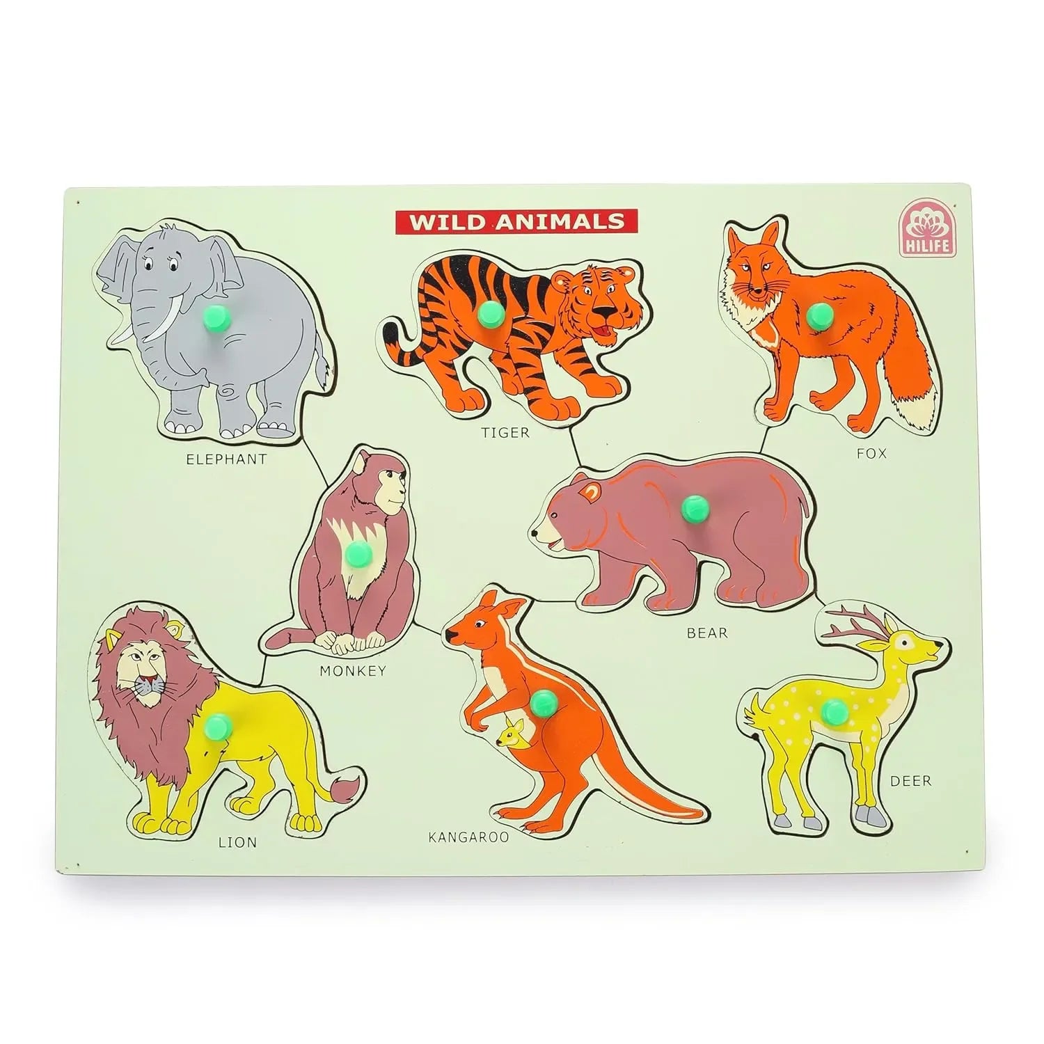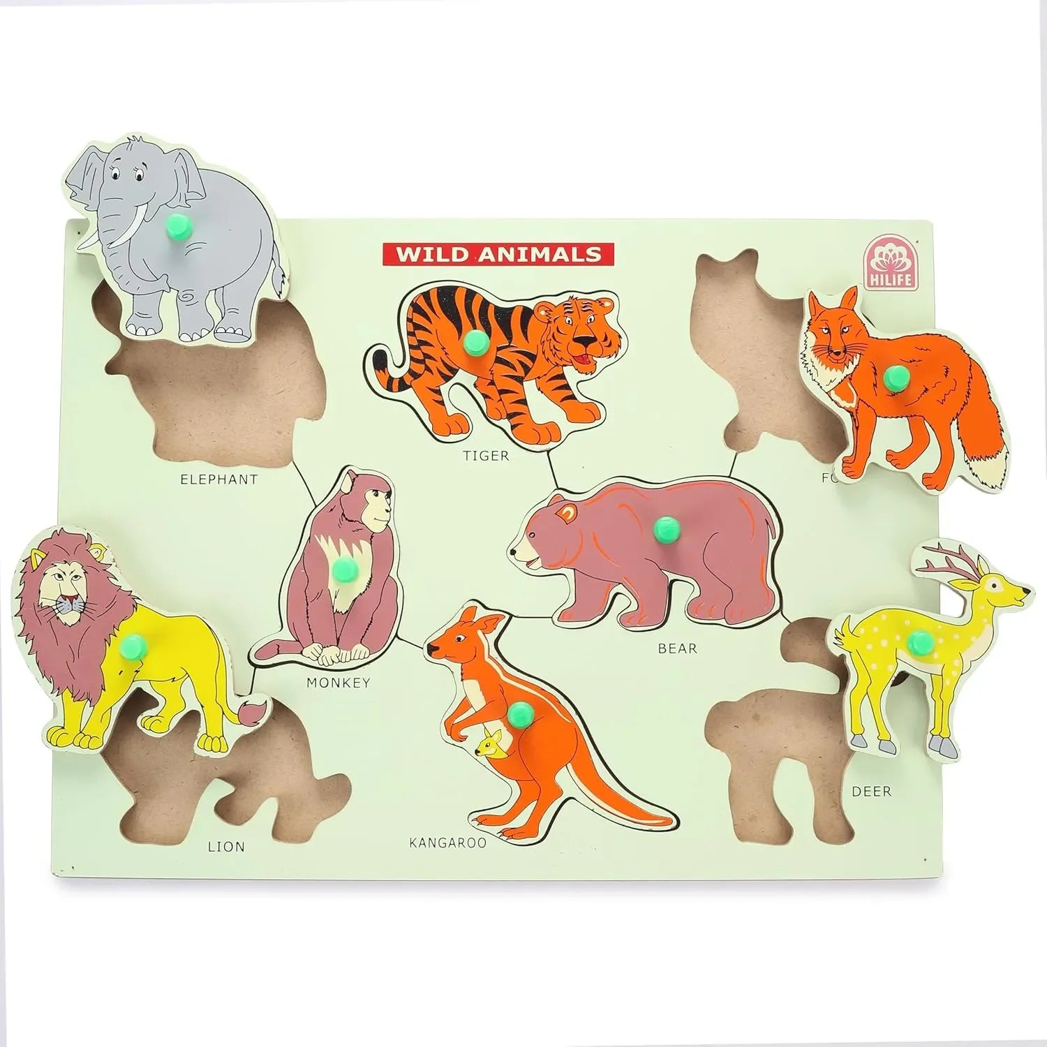 Wild Animals Peg Puzzle Board: Features a collection of popular wild animals such as lion, elephant, giraffe, zebra, and more to build early recognition skills.