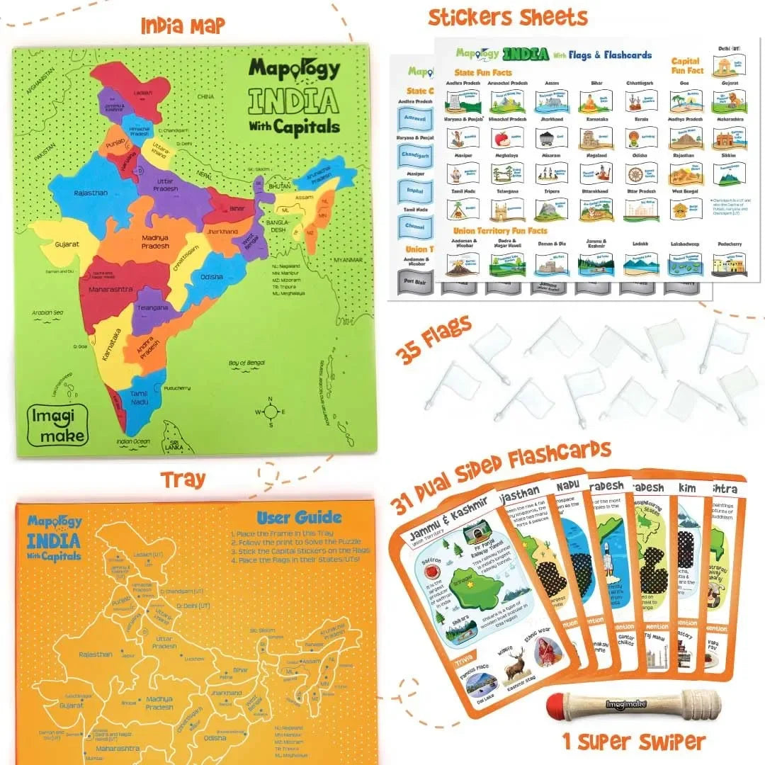 Explore India like never before with Imagimake Mapology India Map with Flash Card, an innovative blend of educational puzzle and interactive card game designed for children aged 8 years and above. This multi-component learning toy invites kids to dive deep into the geography, history, and culture of India by solving a 24-piece EVA foam India map puzzle, placing flags on capital cities, and playing with a set of 31 swipe-and-reveal flash cards. As they piece together the map, swipe to reveal hidden facts, and challenge friends in engaging quizzes, kids get hands-on exposure to over 200 facts about Indian states, union territories, their capitals, and lesser-known trivia.