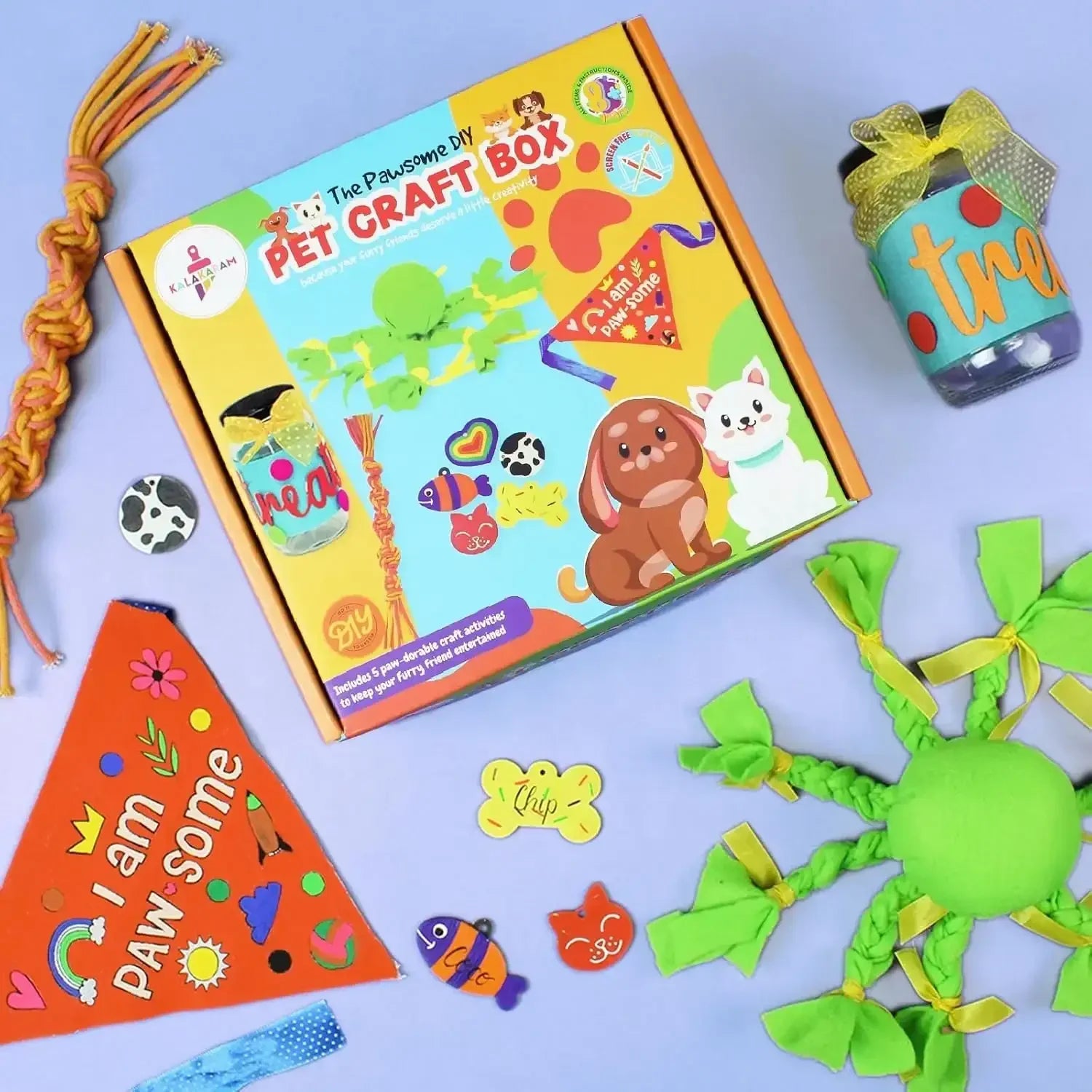 • Create 5 Unique Pet-Themed Crafts: Includes everything you need to make five delightful crafts such as a fleece toy, painted pet tags, macrame rope toy, custom scarf, and treat jar.