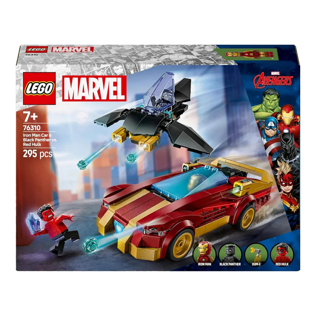 The LEGO Marvel Iron Man Speed Car & Black Panther Aerial Battle Set 76310 features fan-favourite characters including Iron Man, Black Panther, and Red Hulk, along with Iron Man’s robotic assistant Dum-E. The buildable Iron Man sports car and Black Panther aircraft add depth to play, allowing kids to switch between ground and aerial action seamlessly. Interactive elements enhance the play value and encourage repeat storytelling sessions.