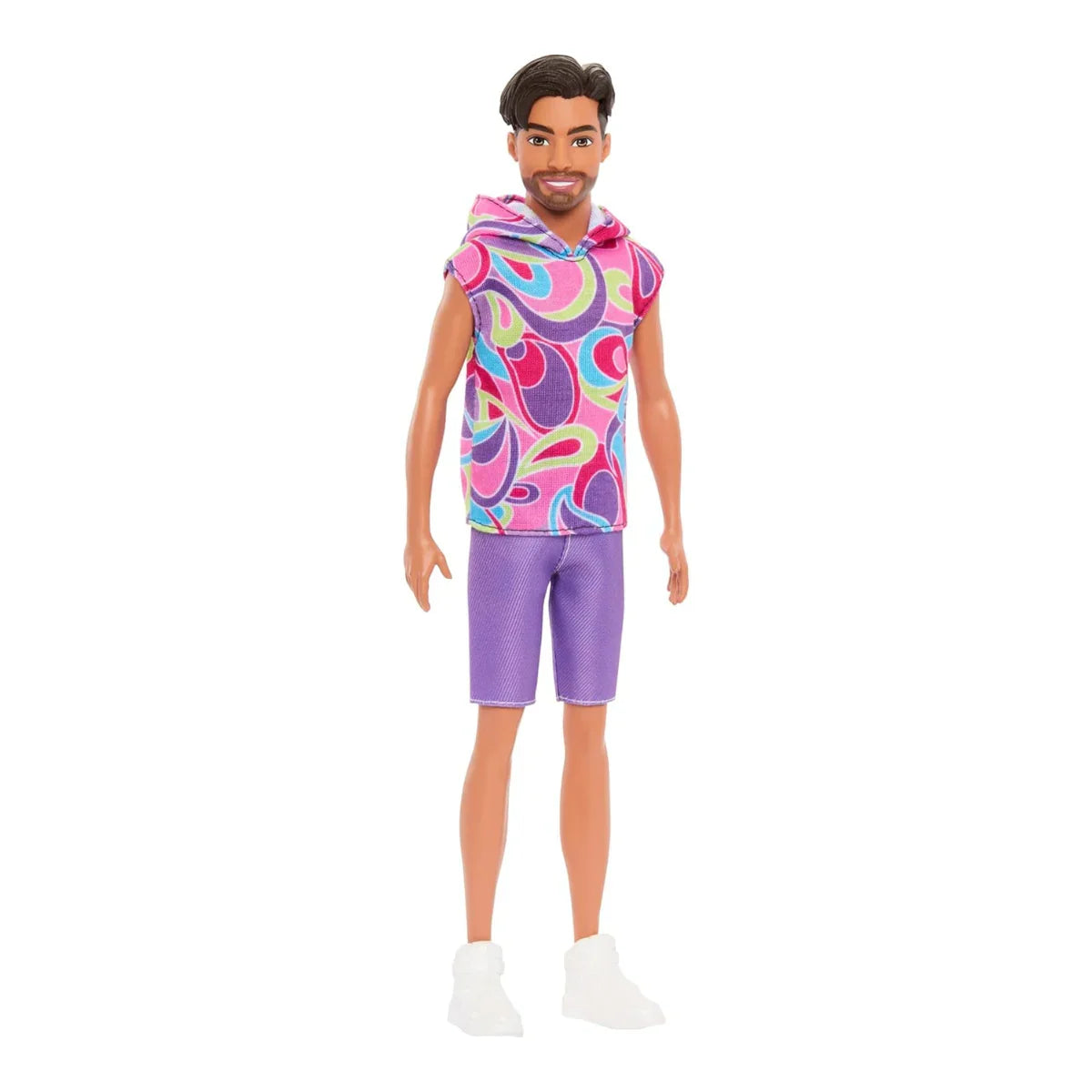 This Ken doll is dressed in a bright hoodie top decorated with a vibrant and colorful graphic print, echoing the bold and playful trends of the early 90s. His sporty purple shorts add a youthful, casual touch, while crisp white sneakers complete the ensemble, giving him a fresh and energetic vibe. With his slender body type, sculpted brunette hair styled in a trendy cut, and a short beard for added detail, the Barbie Fashionistas Ken Doll #227 blends classic nostalgia with contemporary fashion. Designed to inspire endless storytelling, styling, and roleplay, this doll not only enhances creative playtime but also serves as a keepsake for collectors celebrating Barbie’s milestone anniversary.
