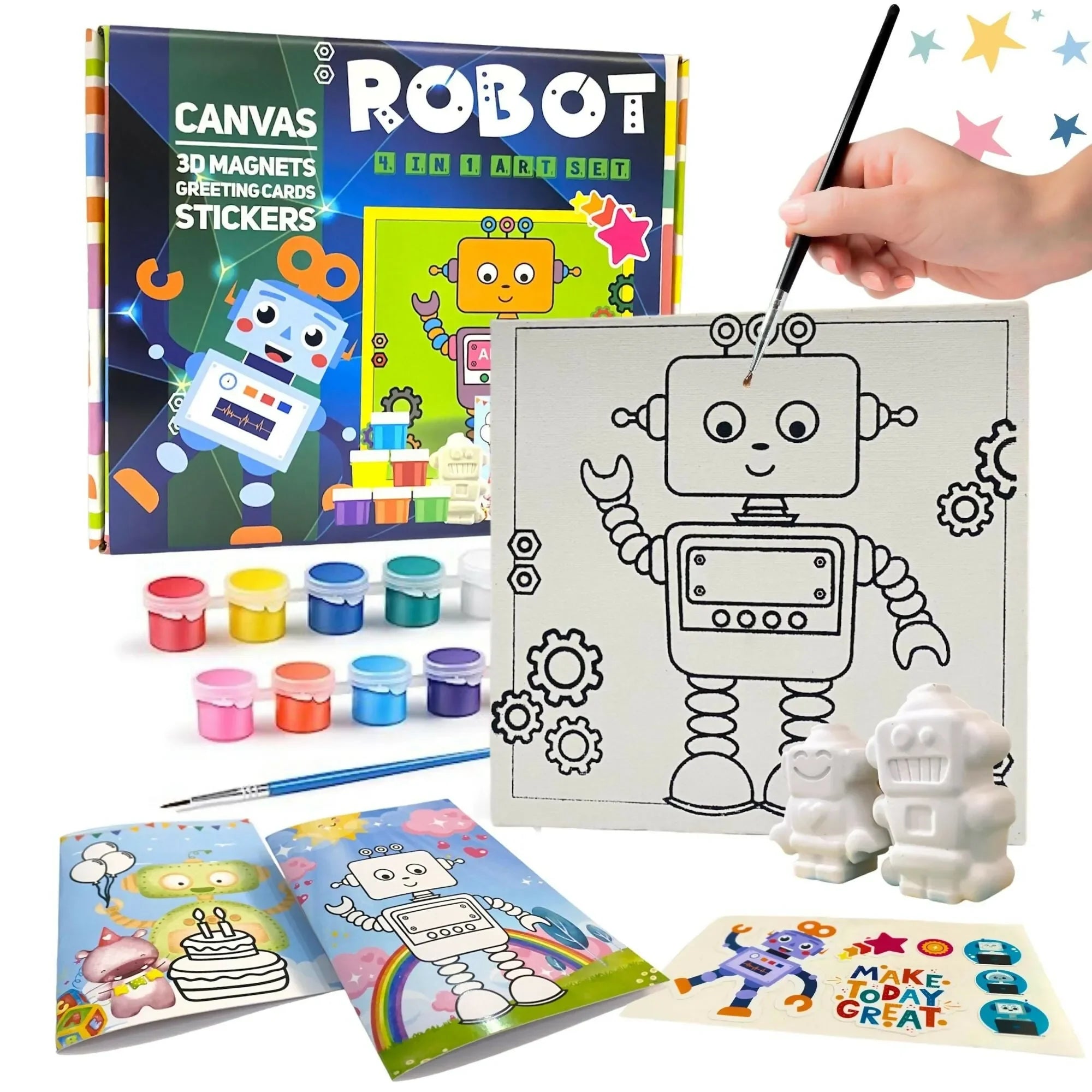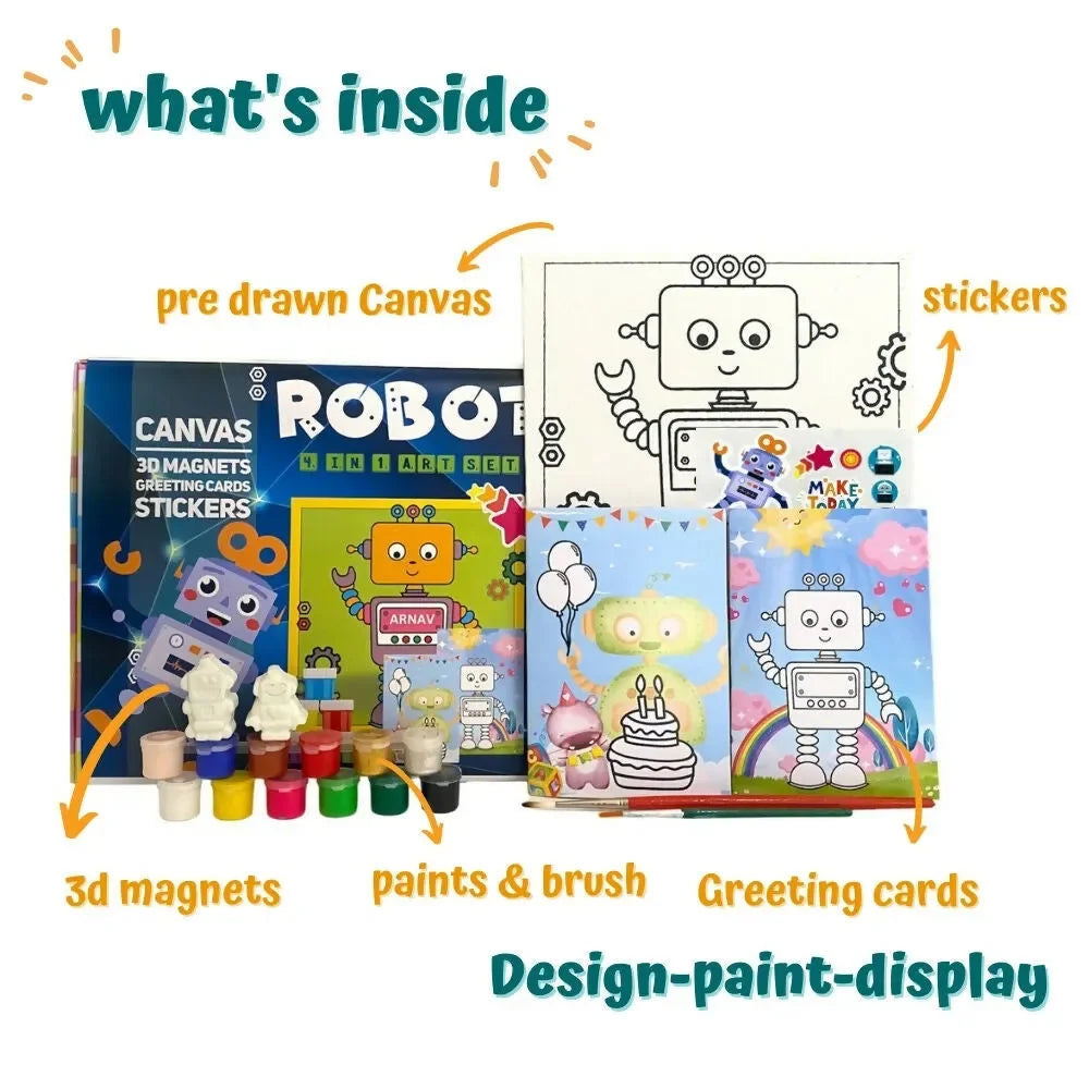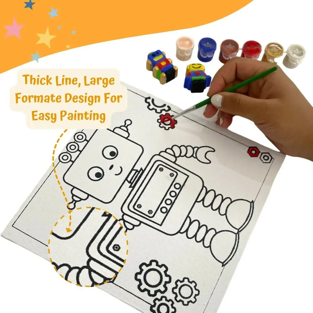 🤖 Robot-Themed Canvases – Includes four fun pre-drawn robot canvases that kids can paint and personalize.