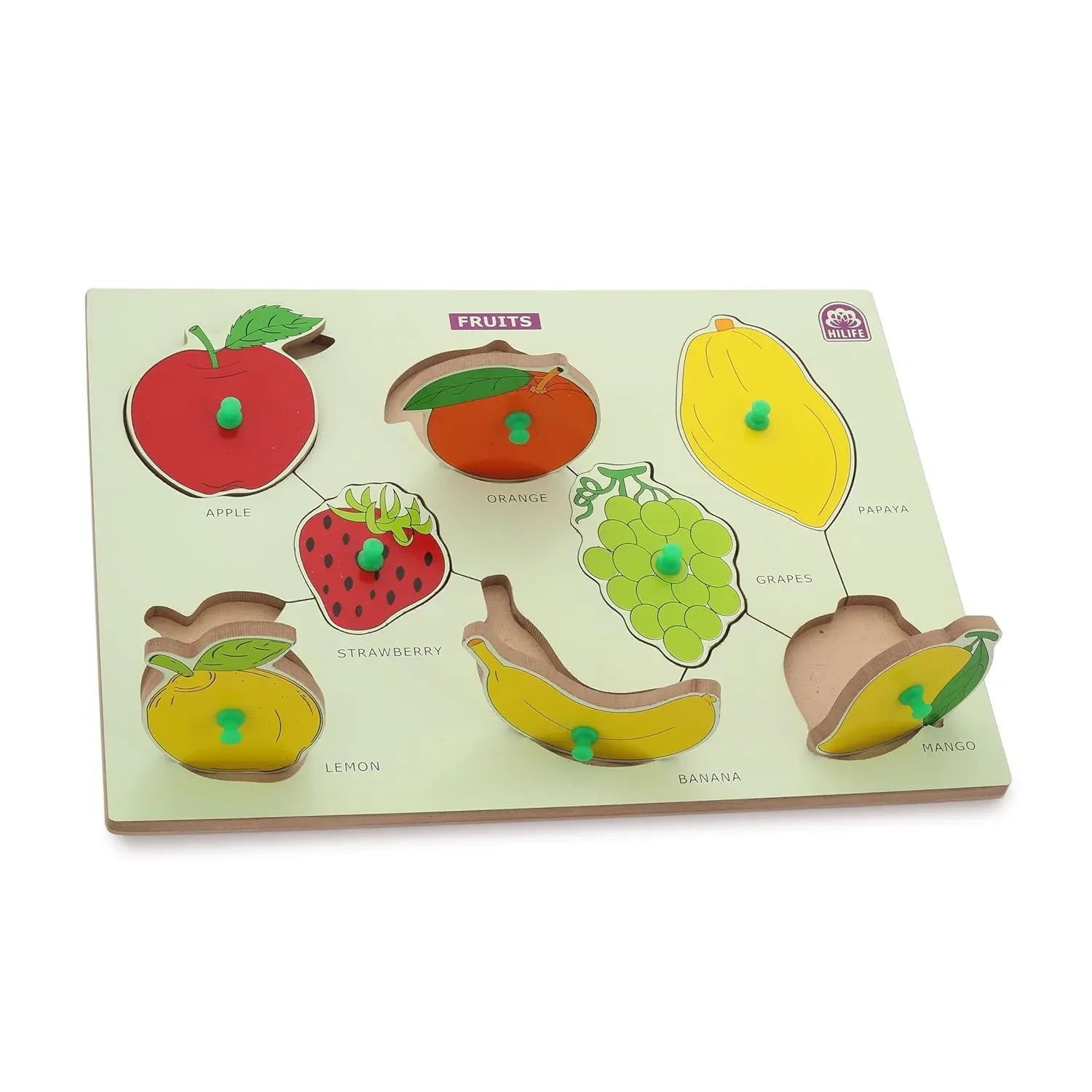 Introduce your little one to a fun and interactive way of learning with the HILIFE Educational Fruits Puzzle Board, Gold Series Edition. Thoughtfully designed for toddlers and preschool-aged children, this wooden peg board toy offers a multisensory approach to early education. With vividly illustrated fruit pieces like apple, banana, orange, mango, and more, this puzzle helps children recognize and name common fruits while promoting healthy food awareness from an early age. Each piece features a sturdy wooden knob that allows small hands to lift and place pieces easily, making it ideal for fine motor development. More than just a toy, this puzzle acts as a foundational learning tool that sparks curiosity, sharpens memory, and encourages independent thinking.