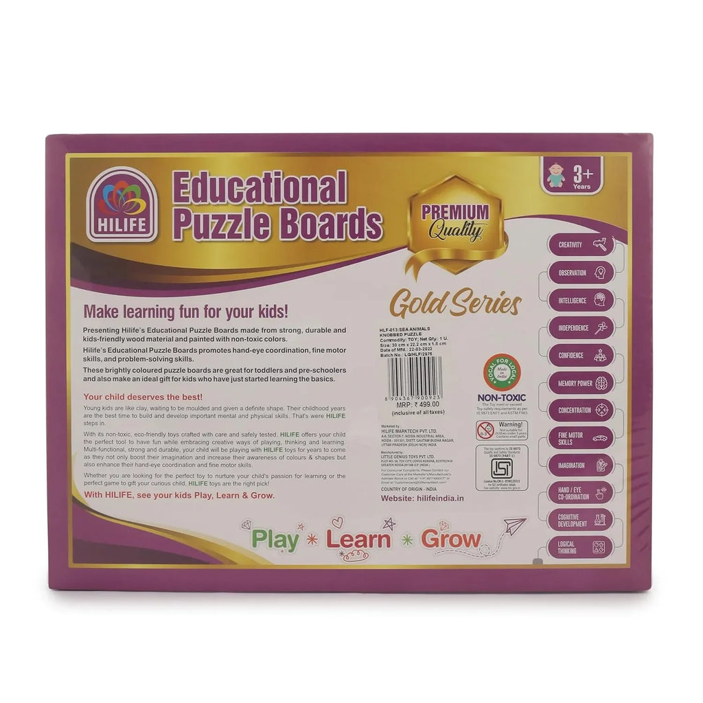 Part of the HiLife Gold Series, this wooden peg board puzzle is constructed from high-quality, eco-friendly wood and painted using non-toxic, child-safe colors. The surface is smooth, with rounded edges, making it a safe and durable choice for young children. Each puzzle piece is equipped with an easy-to-grip peg knob, specially designed for small hands to hold and manipulate easily. As children lift and fit each aquatic animal into its matching slot, they improve their hand-eye coordination, spatial reasoning, and problem-solving abilities. These basic skills are essential for their early cognitive development.