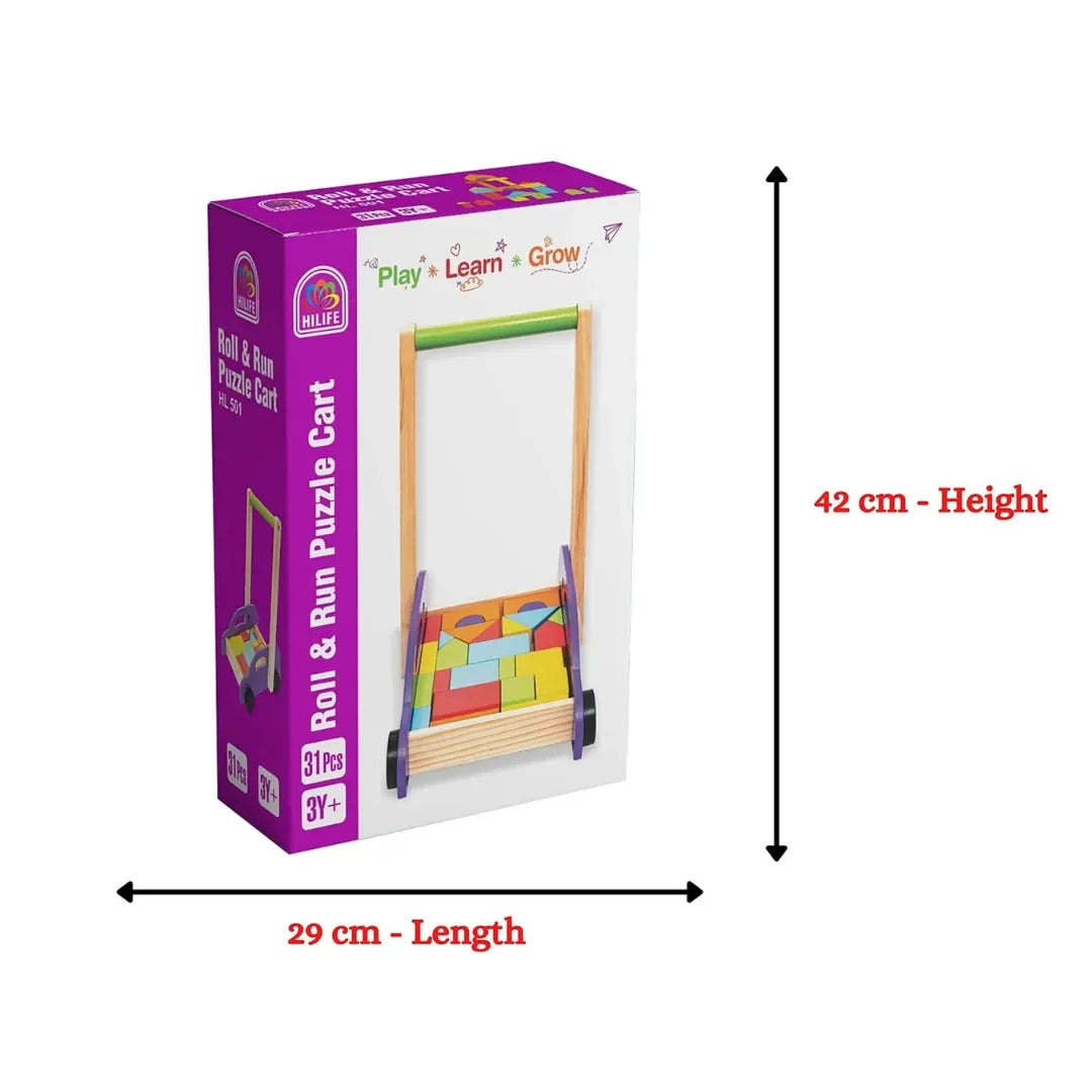HILIFE Roll & Run Puzzle Cart Wooden Walker with Puzzle Blocks | Push & Pull Toy for Toddlers Age 3+ | Montessori-Inspired Activity Cart for Balance, Coordination & Motor Skills